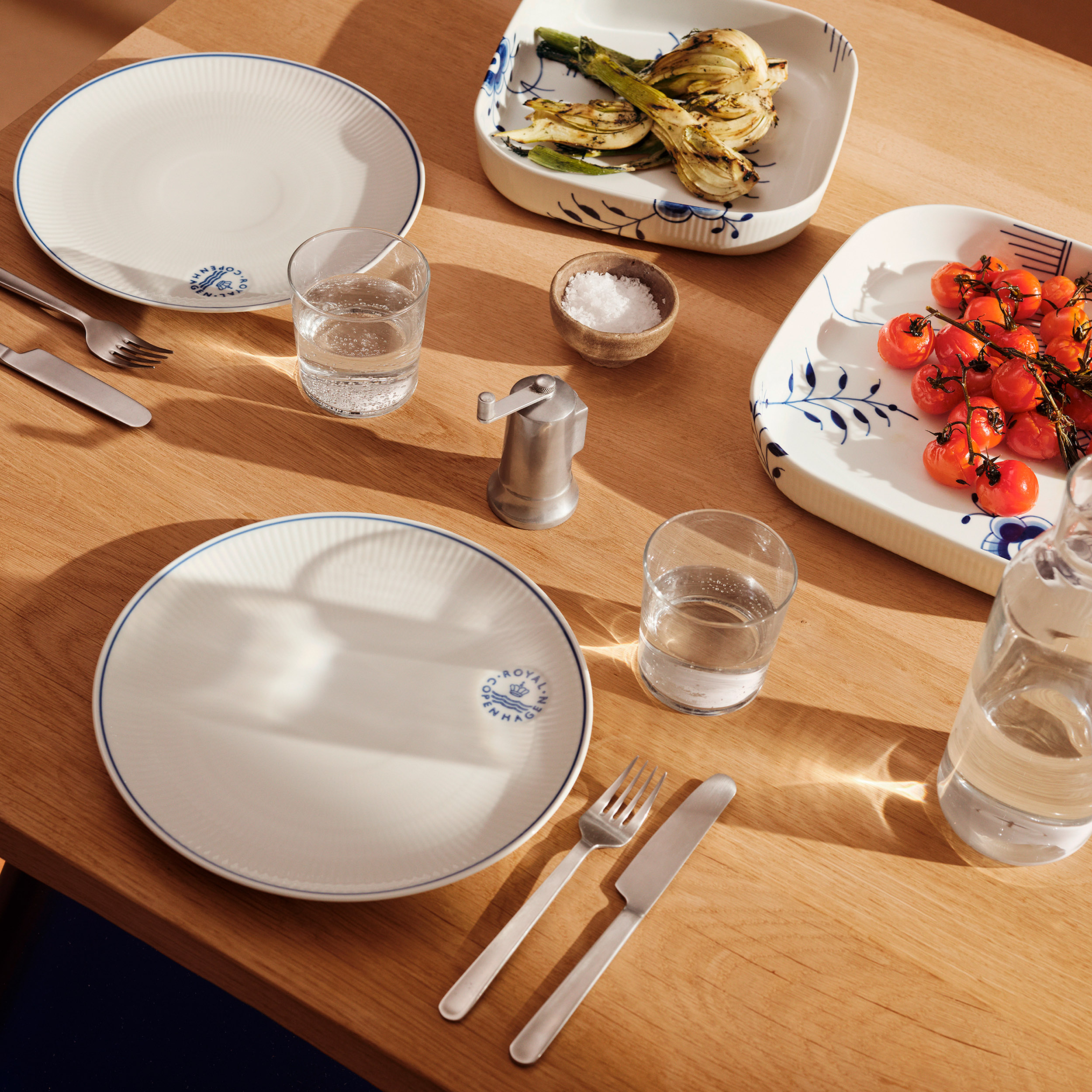 Med et minimalistisk og sofistikeret udtryk er Royal Copenhagens Blueline kollektion maritimt inspireret, og de tre bølgelinjer i forsidestemplet indkapsler Royal Copenhagens blå penselstrøg i et nyt udtryk. Kollektionen er skabt i 2021, og den blå linjes uendelige rejse langs kanten af Blueline er et slående bevis på nøjagtighed. Det iøjefaldende stempel afbryder riflernes rytme og byder dermed på en smuk variation af det velkendte. Med en uendelig blå linje forvandles en kompleks teknik til det diskrete udtryk, der giver den nye kollektion sin underspillede charme og nedtonede ro.