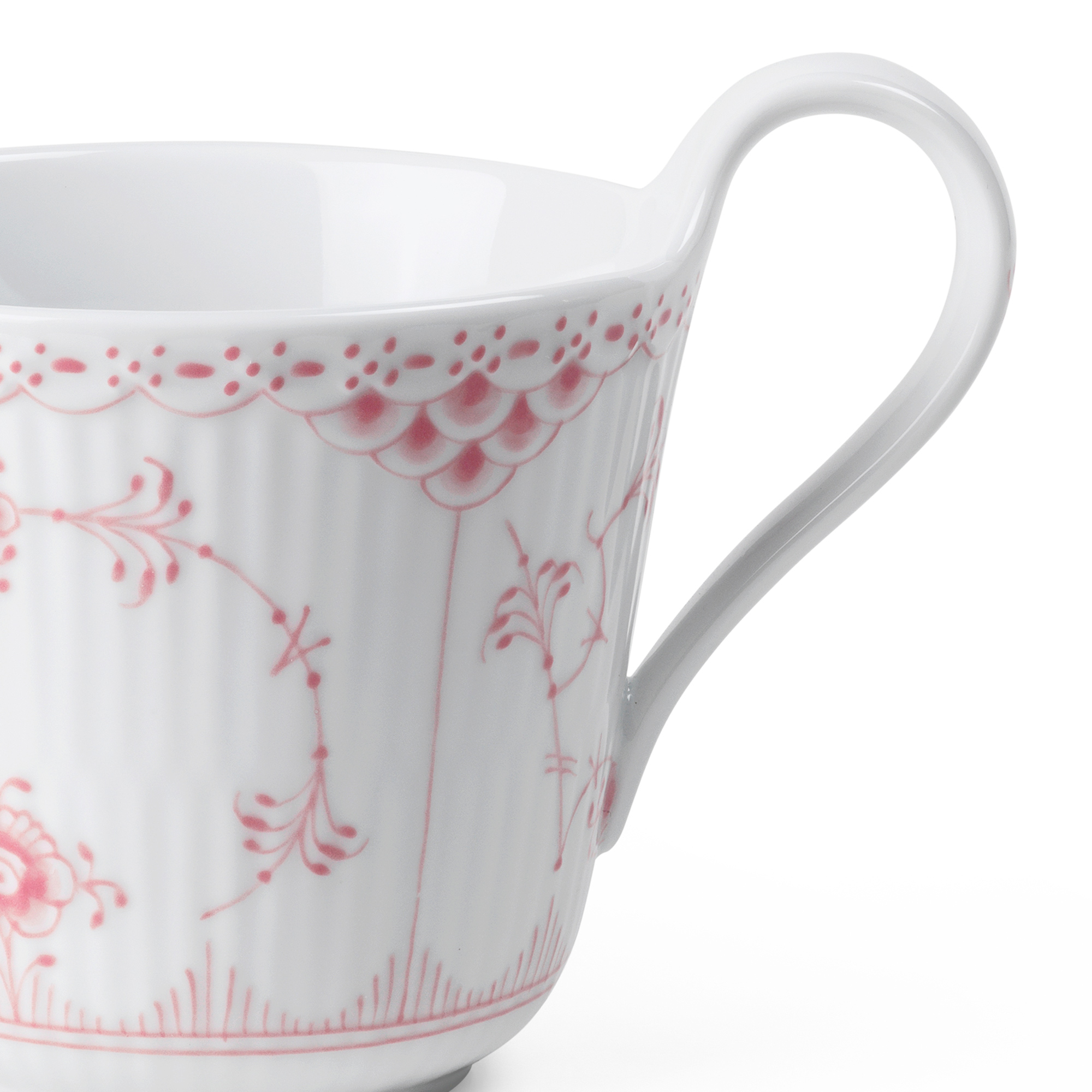 Højhankskoppen i Koral Musselmalet Halvblonde er dekoreret i hånden ved hjælp af in-glaze teknikken, hvor farven påføres før den anden brænding, hvorved malingen smelter sammen med glasuren. Den bløde koralfarve i de detaljerede dekorationer løfter den tidløse form af den elskede højhankskop.