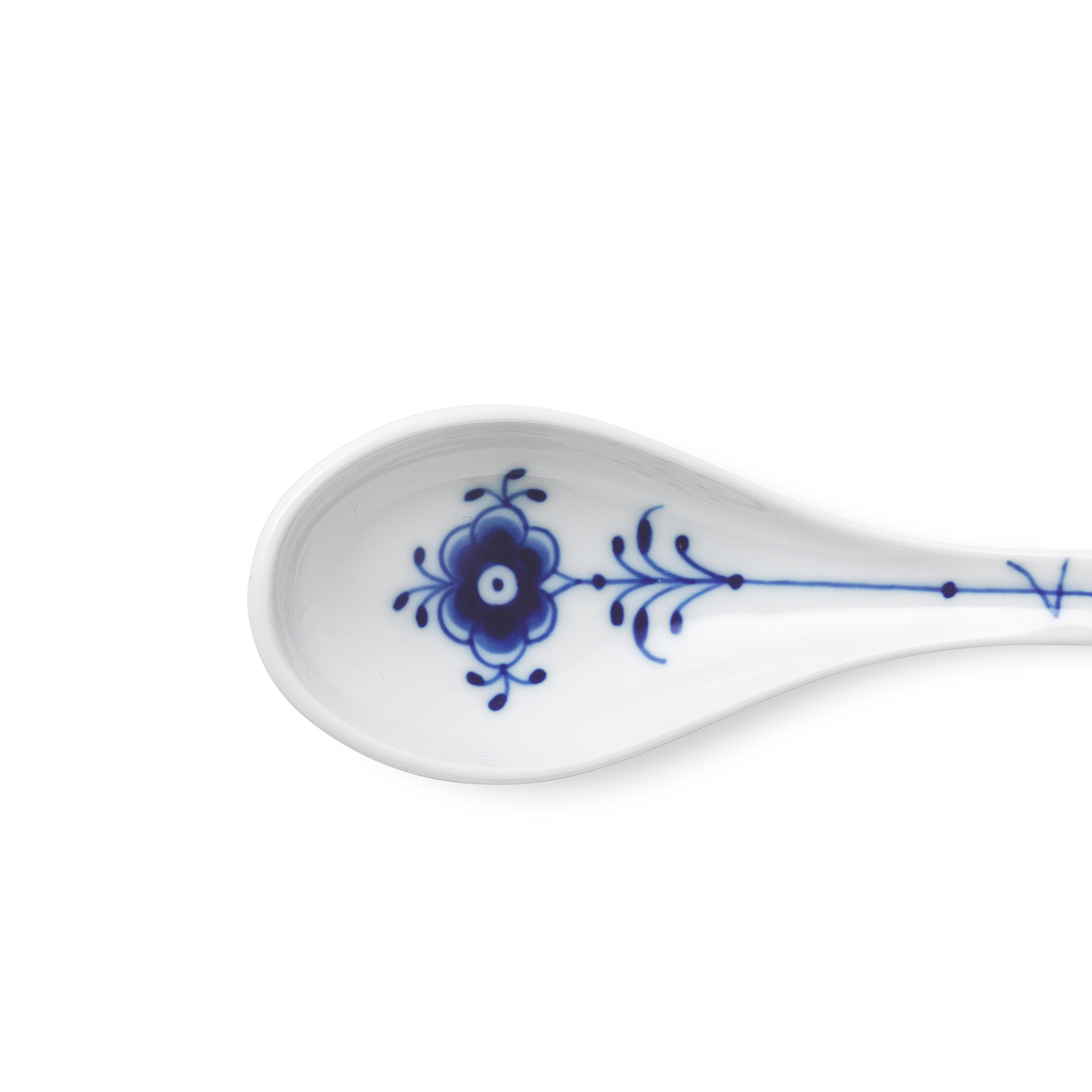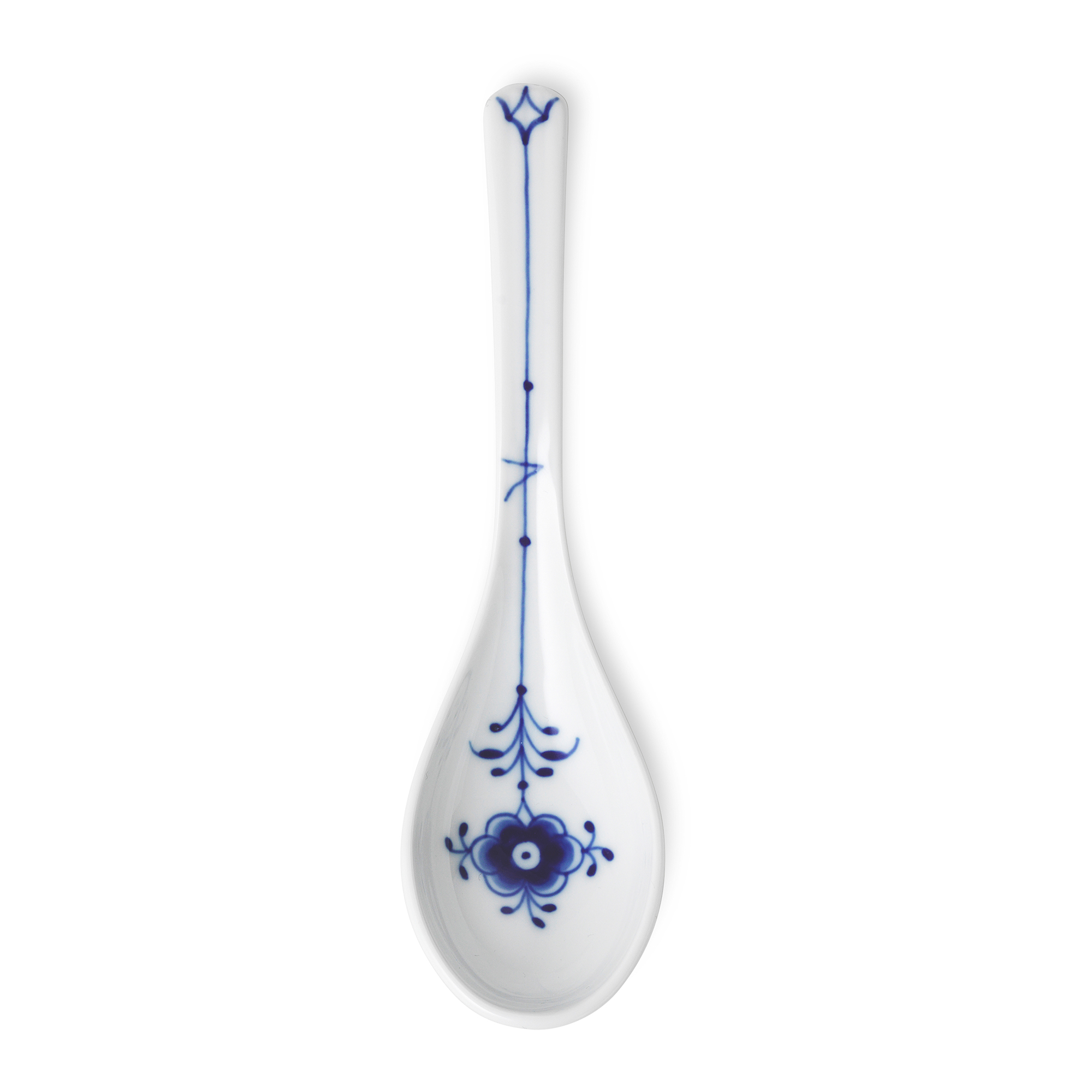 Musselmalet Riflet skeen er en fornøjelse at bruge: De glatte, runde kanter giver den en nem fornemmelse både at holde i og spise med. Det er et elegant lille stykke porcelæn med fint håndmalede detaljer, designet til at ligge stabilt ved siden af skålen, mens den ikke er i brug.
