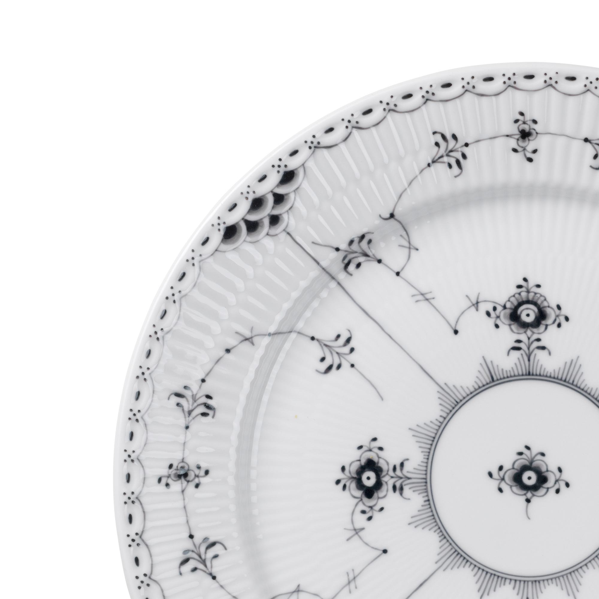 Perfekt som frokosttallerken er den 22 cm Sort Mulselmalet Halvblonde tallerken en elegant tilføjelse til det sorte Royal Copenhagen-univers. Porcelænets blondekant er dekoreret i den markante sorte nuance, og musselmønsteret folder sig ud fra midten.