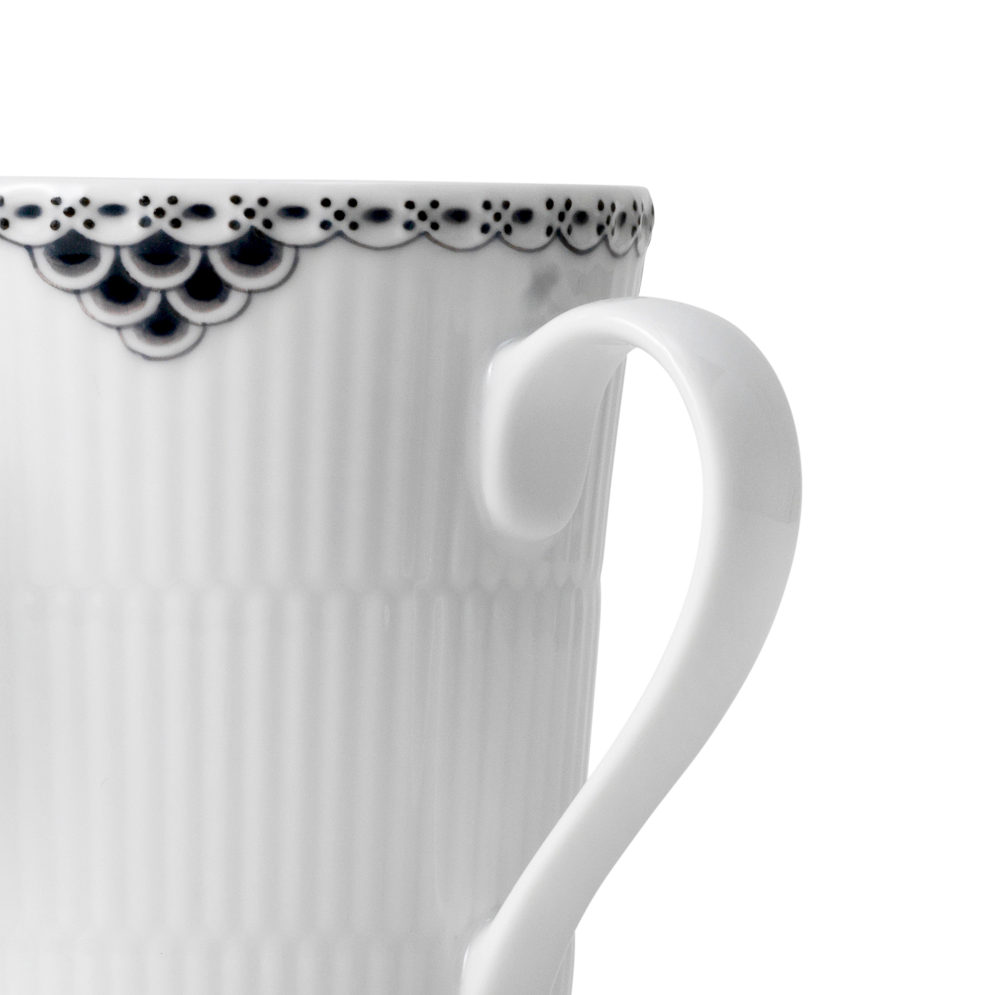 Højden af disse Sort Riflet Blonde krus tillader riflerne at strække sig langs overfladen af porcelænet, indtil de forsigtigt afbrydes af den sorte blondekant. Krusene kommer i et praktisk sæt af to. Perfekt til at dele små hverdagsøjeblikke med de mennesker, du holder mest af. Sort Riflet Blonde er baseret på det yndige Prinsesse-stel, men har sit eget særlige, monokrome præg, som ikke vil gå ubemærket hen. Ligesom Prinsesse er Sort Riflet Blonde prydet af en håndmalet blondekant, mens resten af overfladen er uberørt, hvilket skaber en iøjnefaldende kontrast mellem det detaljerede og det simple, som skiller sig ud mere end nogensinde i de sofistikerede sorte nuancer.