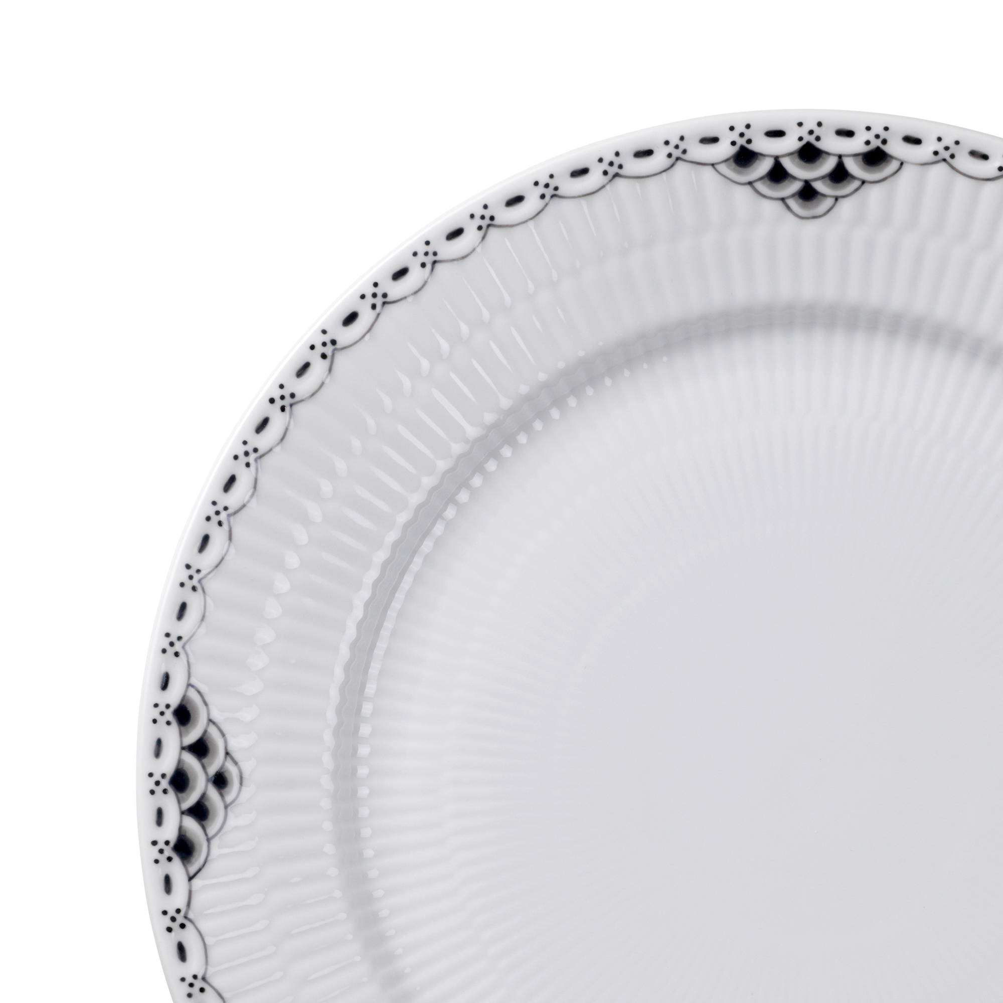 Den 19 cm Sort Riflet Blonde tallerken er den mindste i kollektionen. Den elegante blondekant fungerer som en smuk ramme til søde desserter eller lækre oste. Den sortes dristighed blødes op af kniplingsdekorationernes delikatesse.
