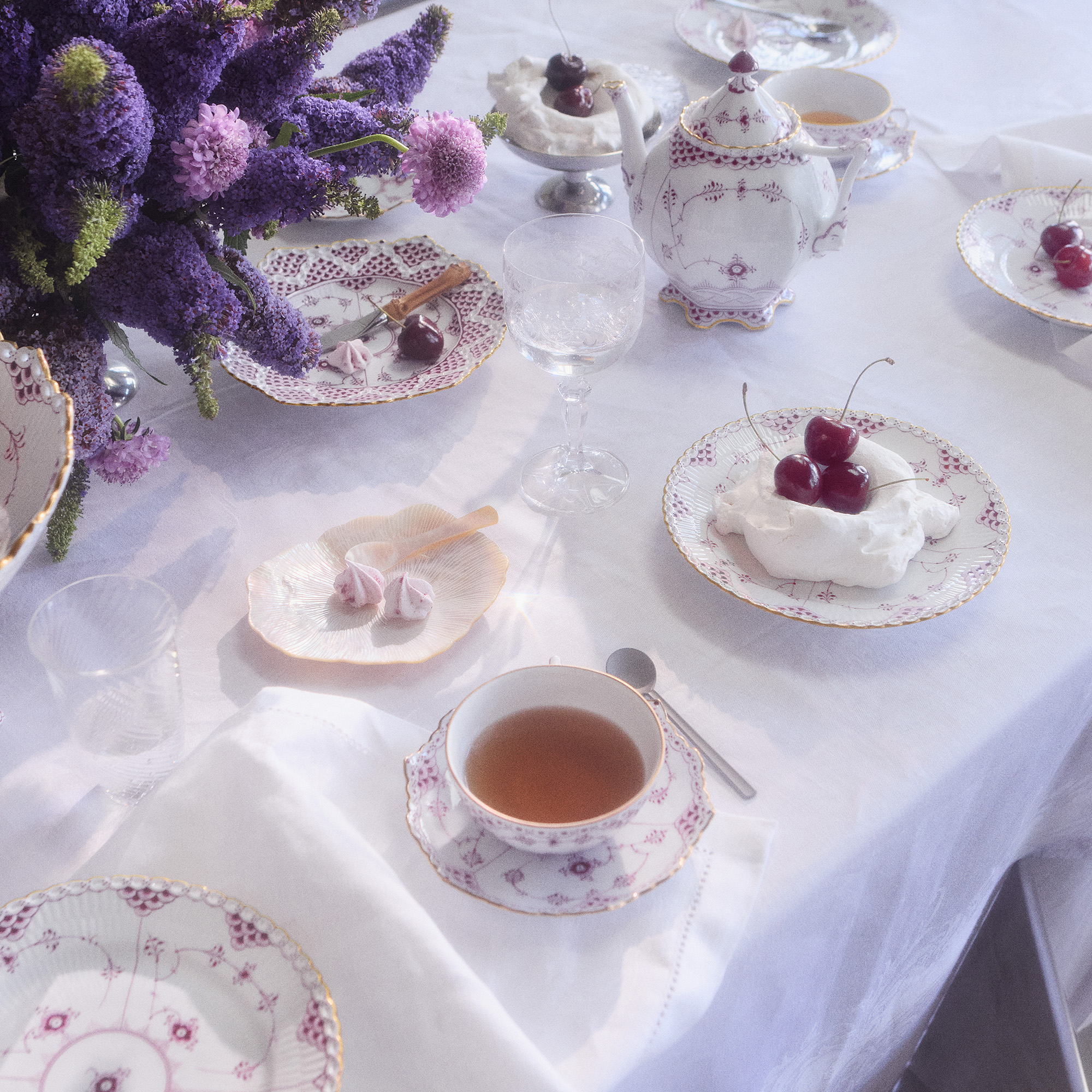 Die violette Farbe stammt aus dem 17. Jahrhundert, als der deutsche Alchemist A. Cassius den leuchtenden, intensiven Farbton entwickelte. Als Frantz Heinrich Müller 1775 die Königlich Dänische Porzellanmanufaktur gründete, hielt er genau diese Formel in seinem Notizbuch fest. In späteren Jahren hat Royal Copenhagen das historische Rezept für das handgemalte Aufglasurdekor auf Musselmalet Halbspitze Purpur wieder zum Leben erweckt.