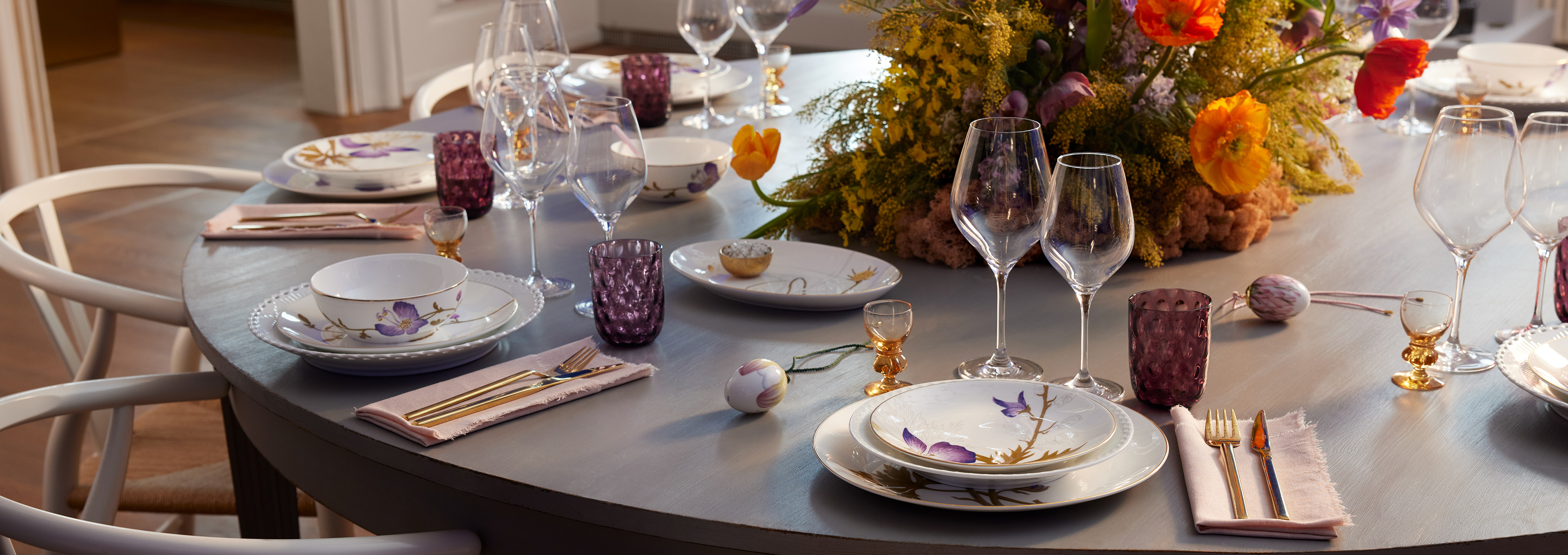 Use the oval dishes as serving dishes in a romantic combination with plates in sizes from 22 cm to 27 cm and set a flowering lunch table or dinner table or make a stack of plates for your guests to choose their favourite flower. The smaller 26 cm dish is also useful as a dinner plate or a steak plate.
