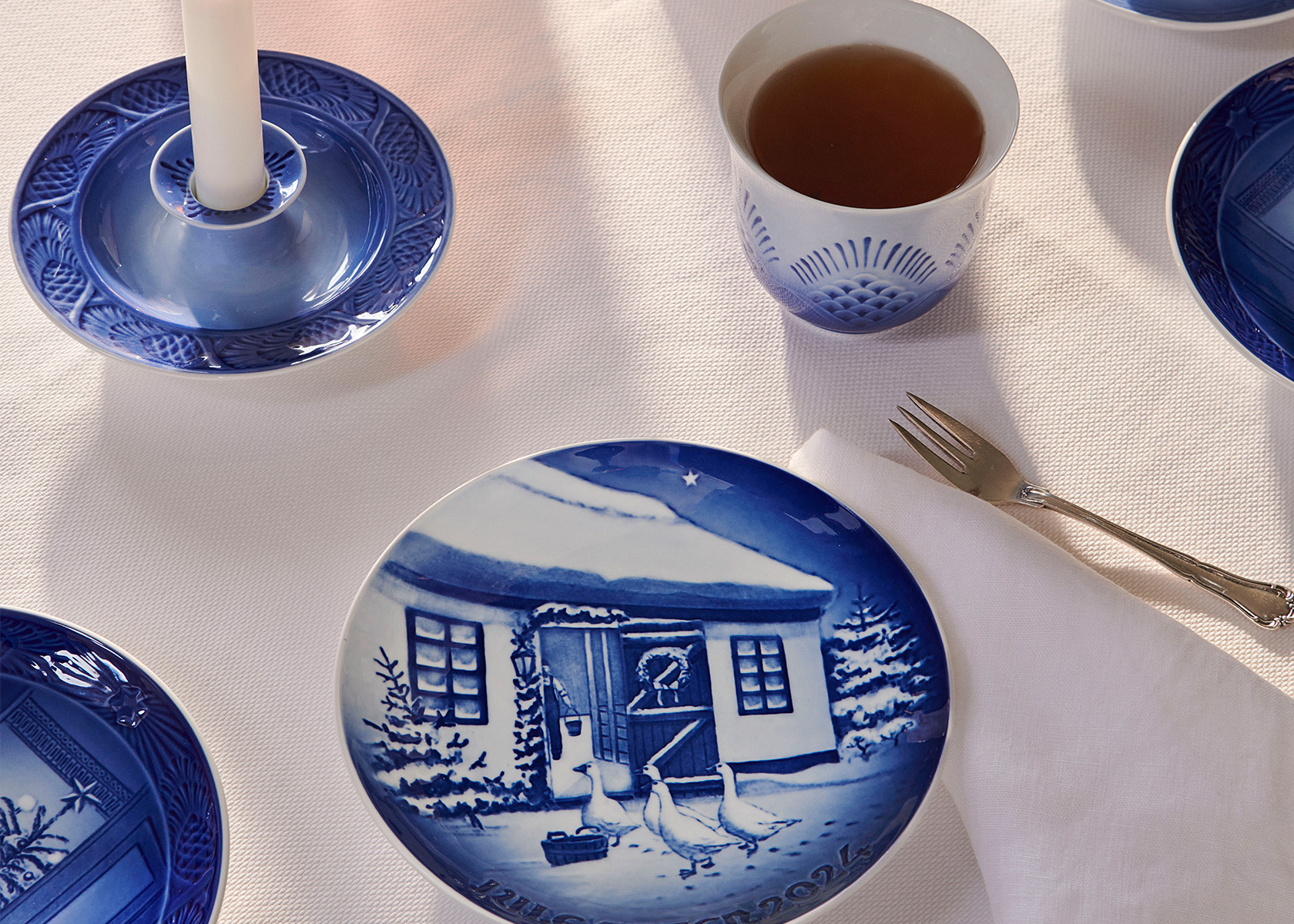 Die Idee hinter dem Jahresteller, wie wir ihn heute kennen, stammt von der Nordischen Industrie-, Landwirtschafts- und Kunstausstellung, die 1888 in Kopenhagen stattfand. Eine enorme Veranstaltung, die hauptsächlich im und um den Tivoli-Garten stattfand und 1,3 Millionen Gäste in ein Land mit nur 2 Millionen Einwohnern brachte. Die Königliche Dänische Porzellanfabrik hatte im Rahmen ihrer Ausstellung auf der Messe eine Reihe von Tellern geschaffen, die die Podien säumten, die zur Präsentation genutzt wurden. Die Teller waren in Blau dekoriert und mit dem Logo der Fabrik versehen: die Krone und drei geschwungene Linien.