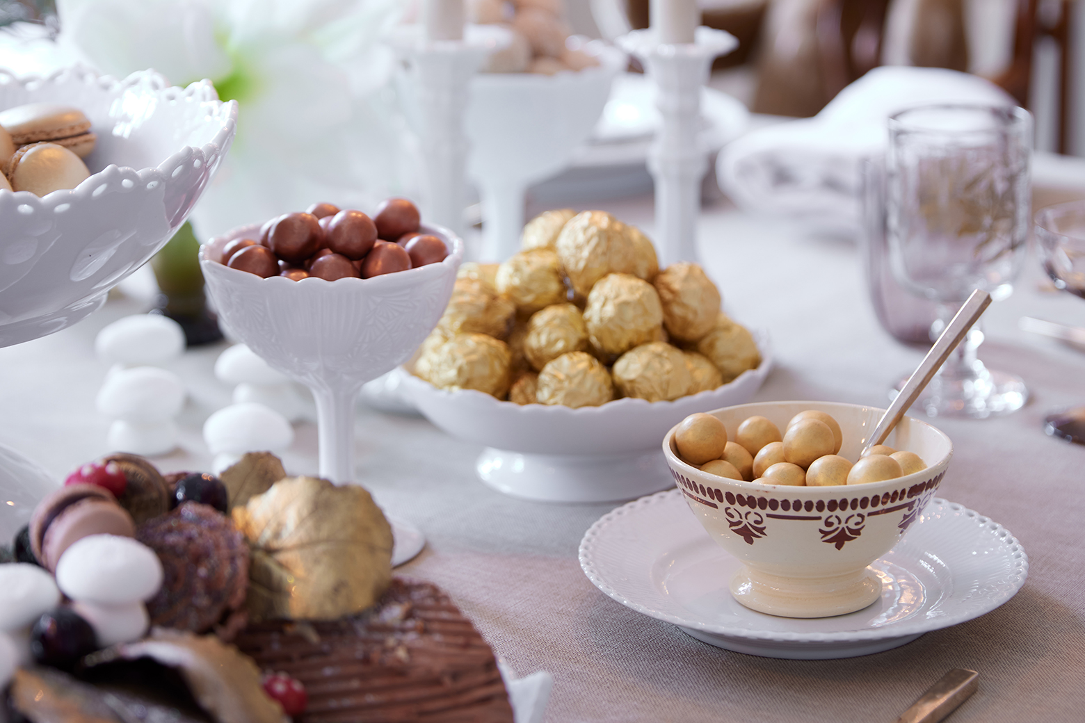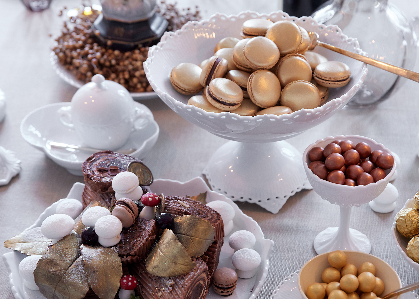 Pieces from Royal Copenhagen’s White Fluted Full Lace and White Fluted Half Lace are combined with French vintage plates adorned with flowers. Antique French drinking glasses and white candle holders add a soft mood in combination with transparent drapes and a light linen tablecloth. As a final touch, a classic French Bouche Noelle cake is served as a supplement to the traditional Danish holiday dinner.