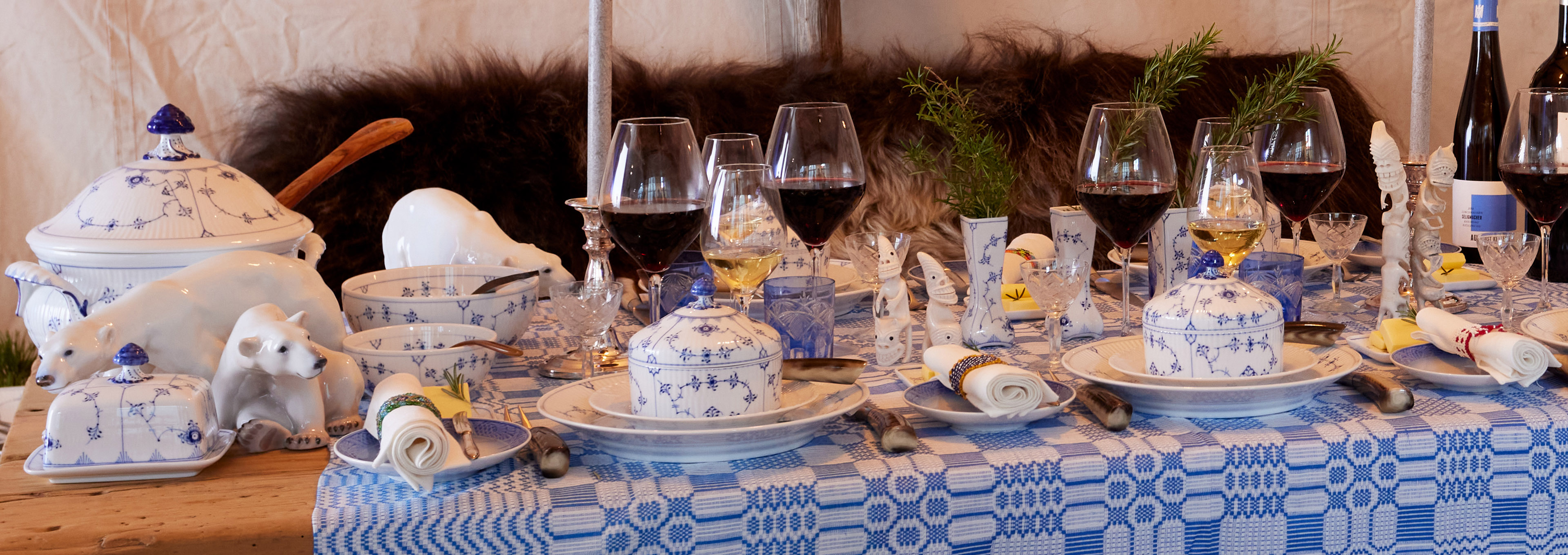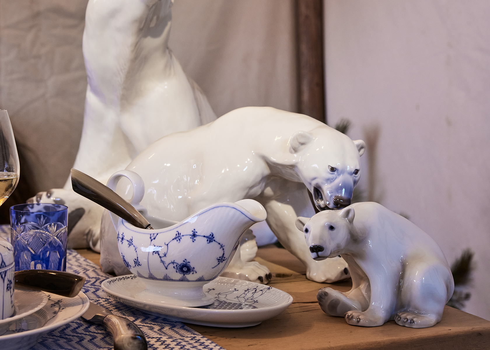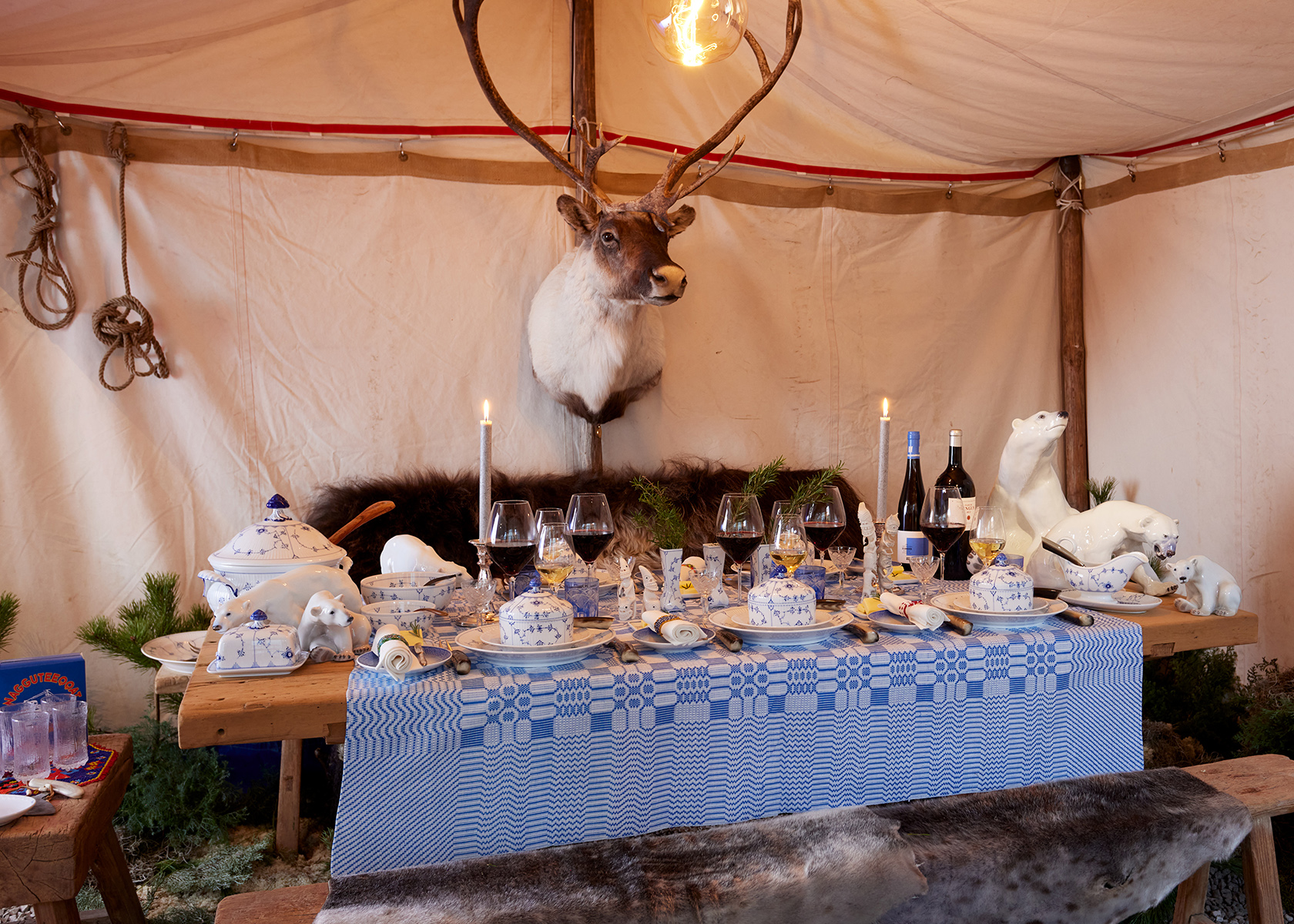 A Christmas dinner in the wilderness of Greenland should be festive; and what is more festive than his grandmother’s collection of classic Blue Fluted Plain porcelain which Adam has been lucky to inherit and frequently uses. The iconic Pattern No. 1 is mixed with the whimsical Royal Creatures collection and the traditional Blue Collectibles from Royal Copenhagen. Scattered around the tent are polar bear sculptures from Royal Copenhagen’s archives mixed with curiosities from Greenland.