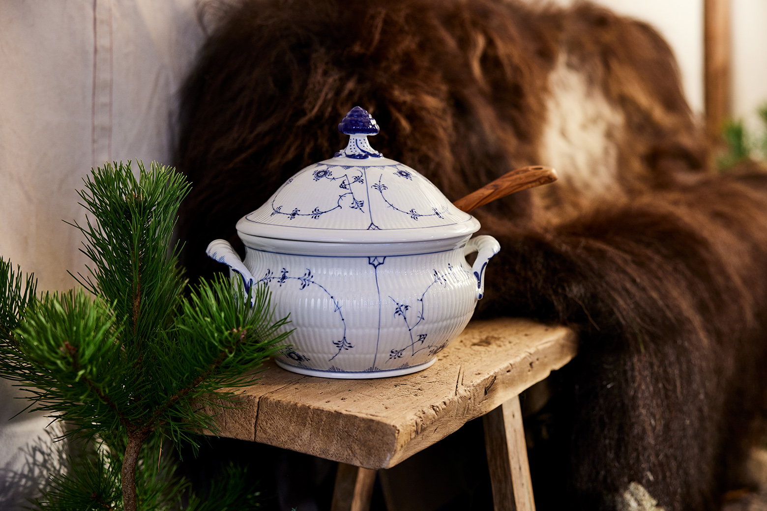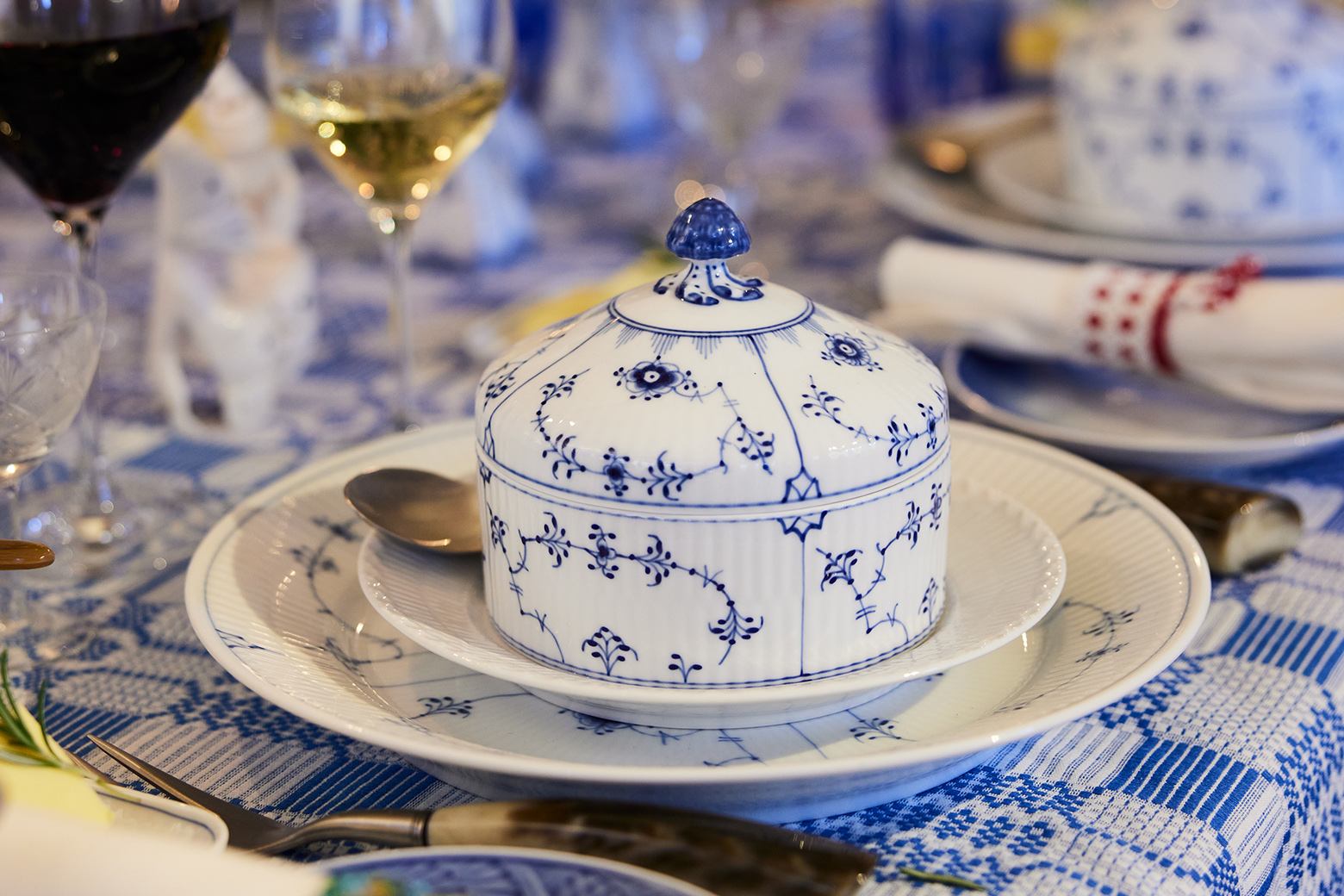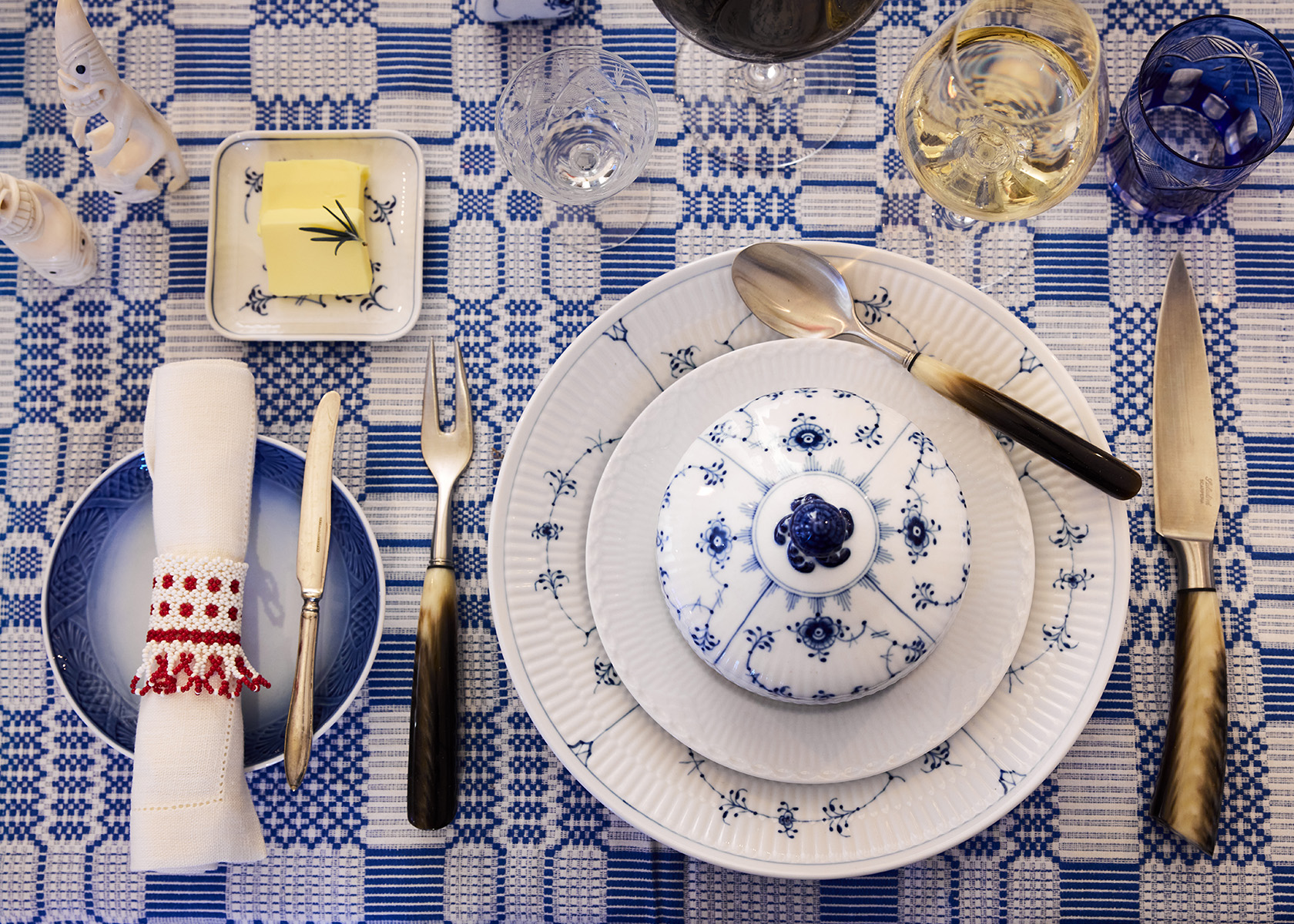A Christmas dinner in the wilderness of Greenland should be festive; and what is more festive than his grandmother’s collection of classic Blue Fluted Plain porcelain which Adam has been lucky to inherit and frequently uses. The iconic Pattern No. 1 is mixed with the whimsical Royal Creatures collection and the traditional Blue Collectibles from Royal Copenhagen. Scattered around the tent are polar bear sculptures from Royal Copenhagen’s archives mixed with curiosities from Greenland.