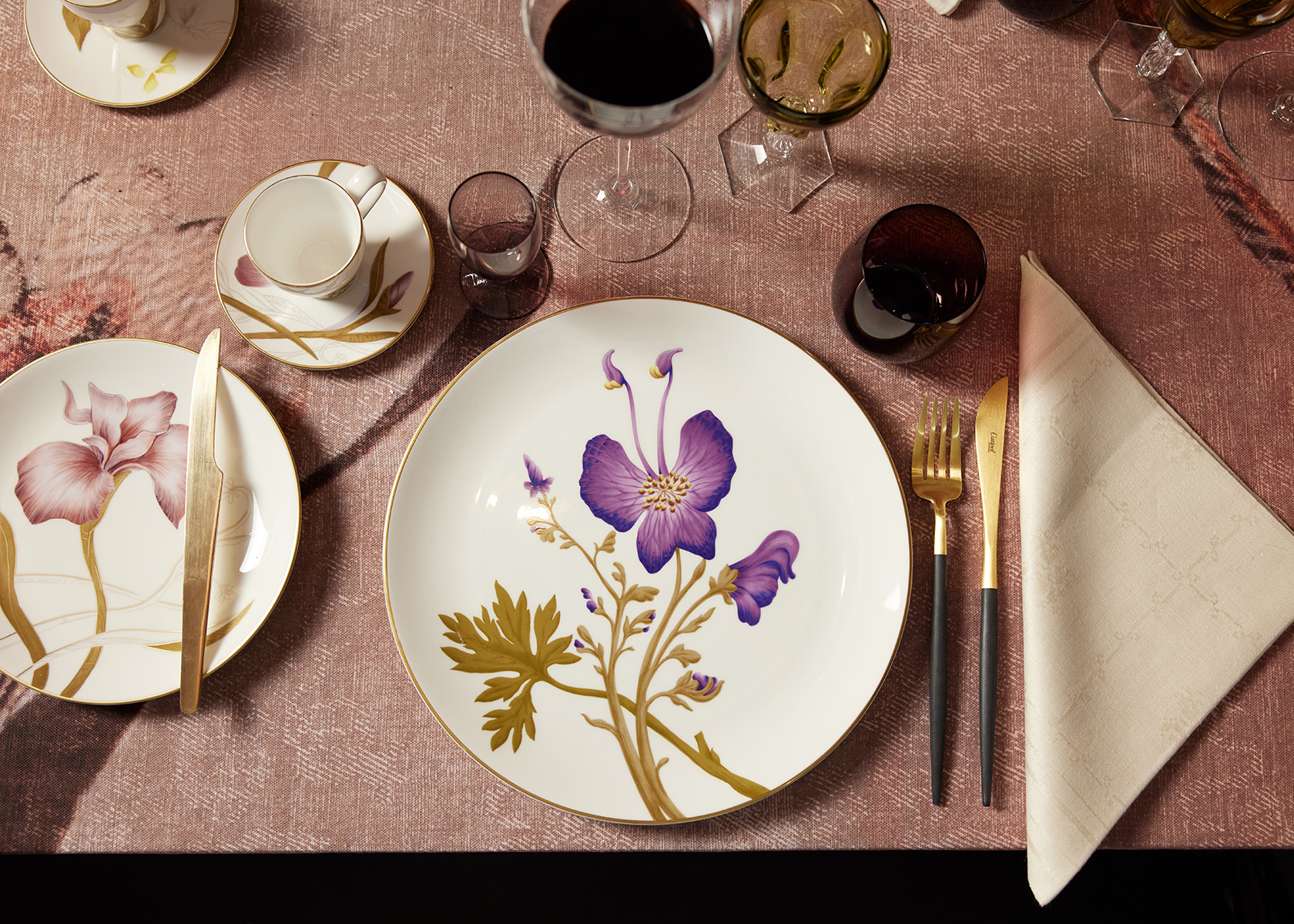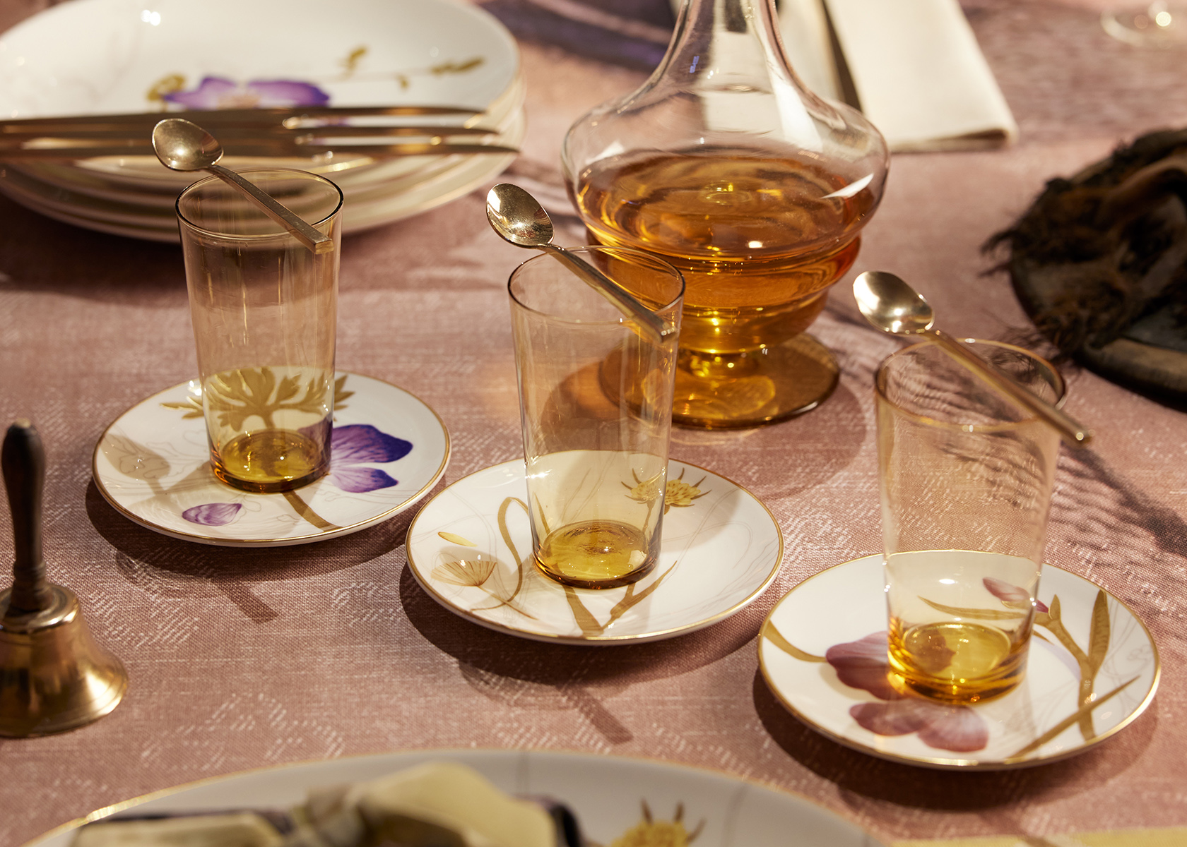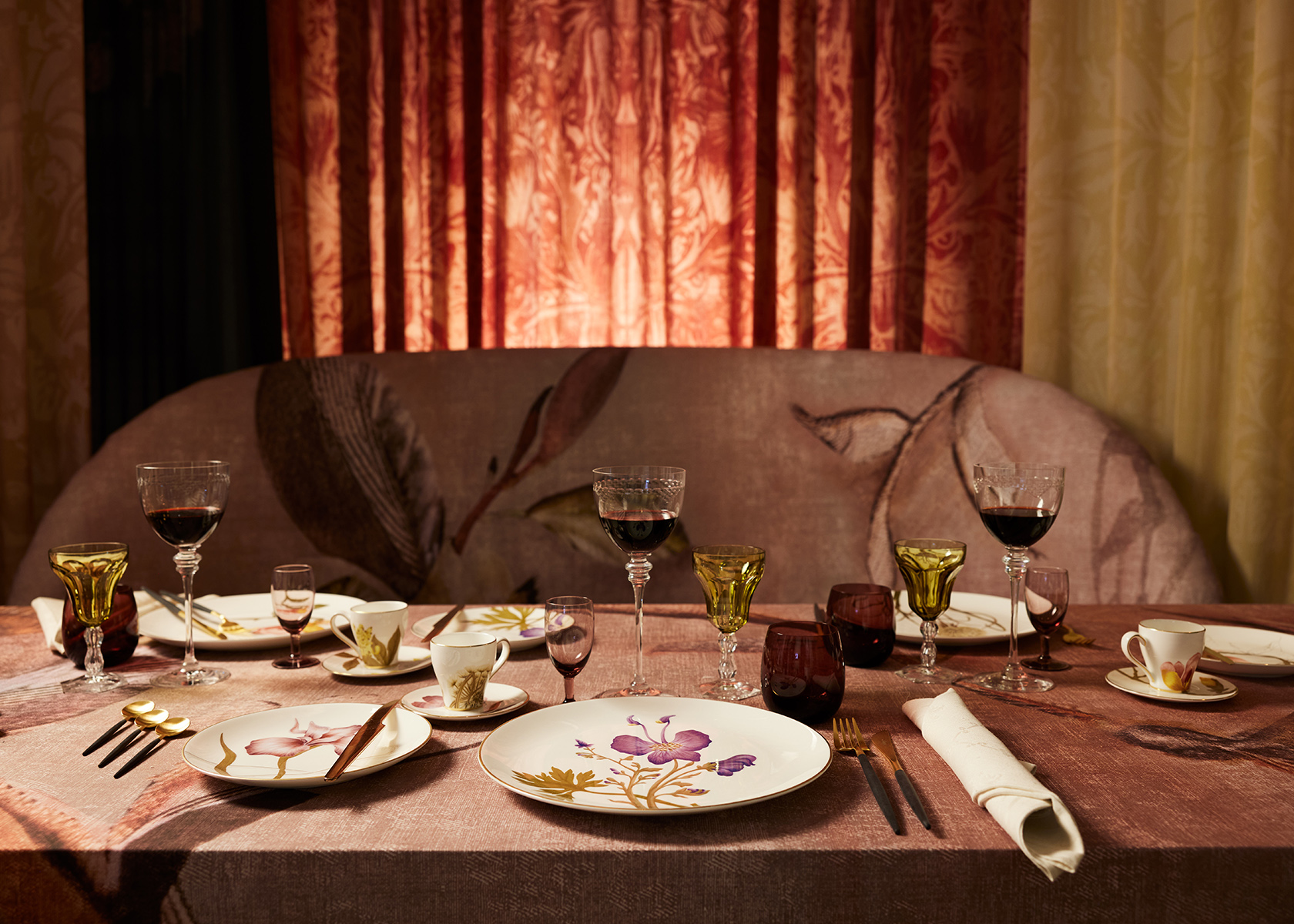 The long table is dressed in a Christmas tablecloth, created for the occasion, which beautifully compliments the poetic Flora collection that Anja has designed for Royal Copenhagen. Plum coloured water glasses and Lalaing crystal glasses are placed among champagne coupes, glasses for port along with espresso cups, carafes and a teapot.