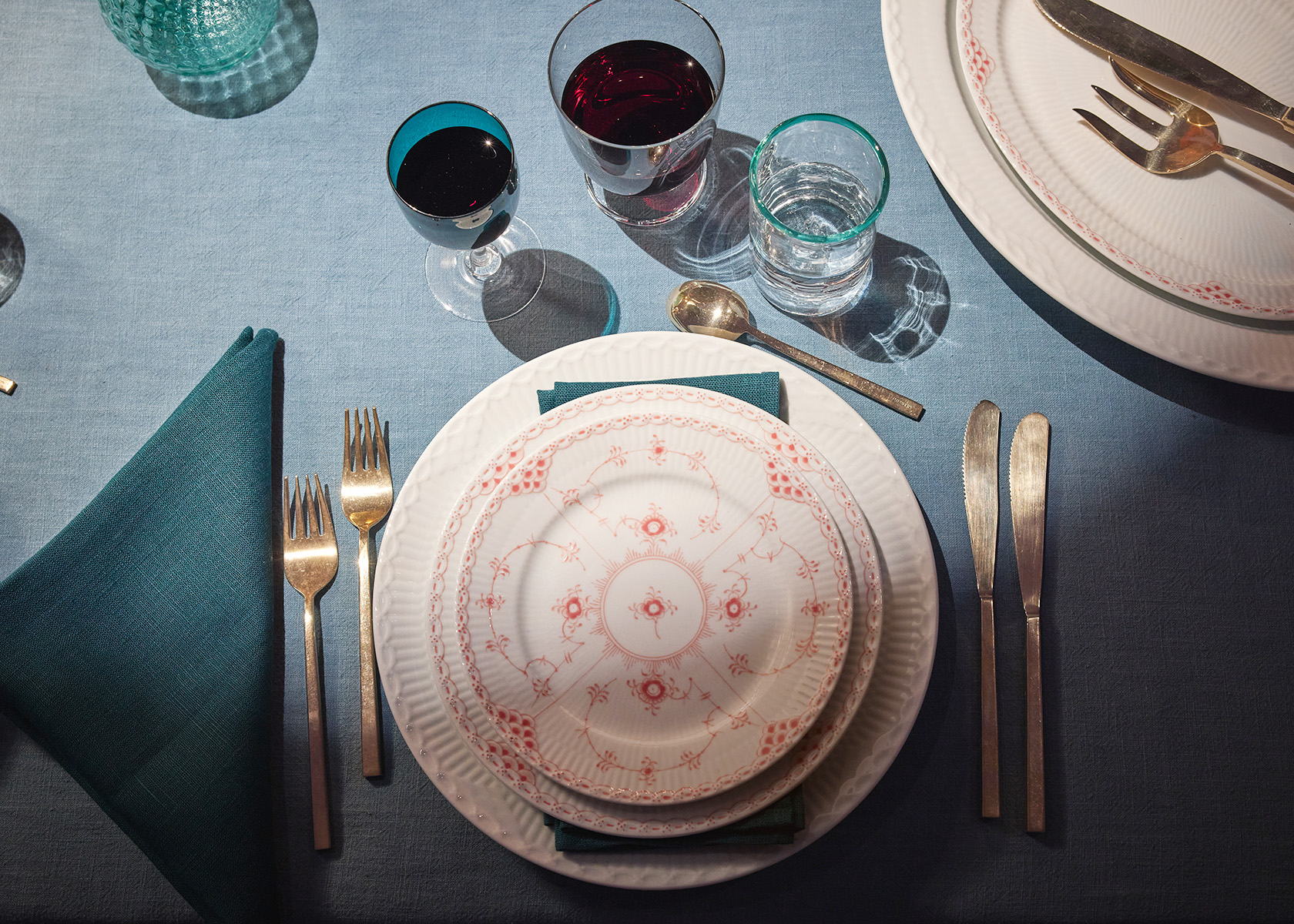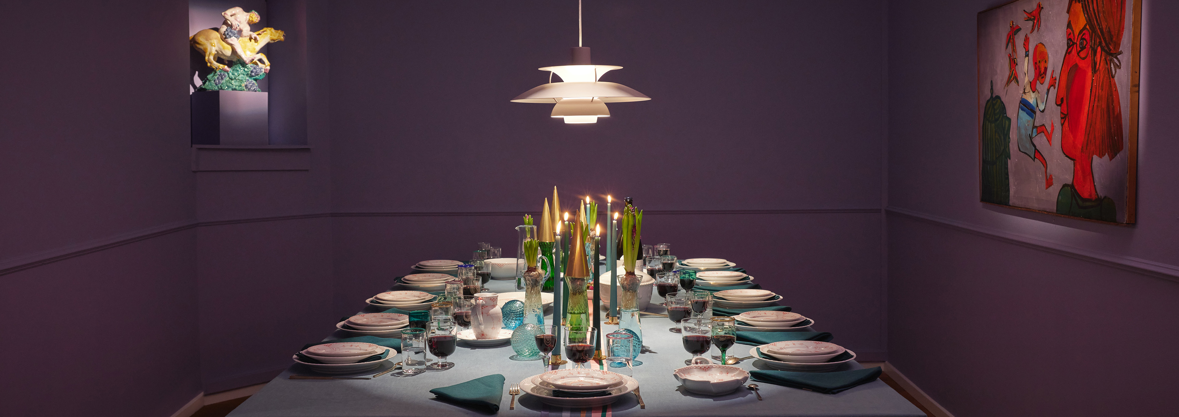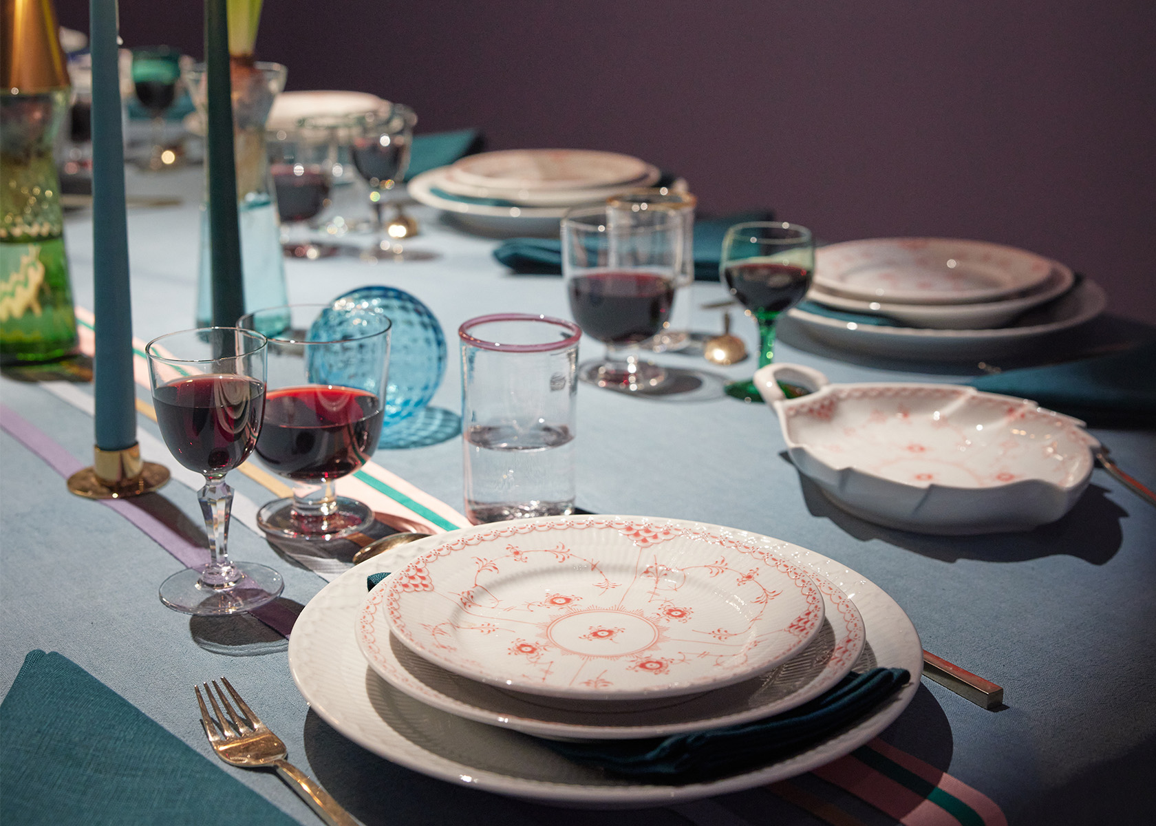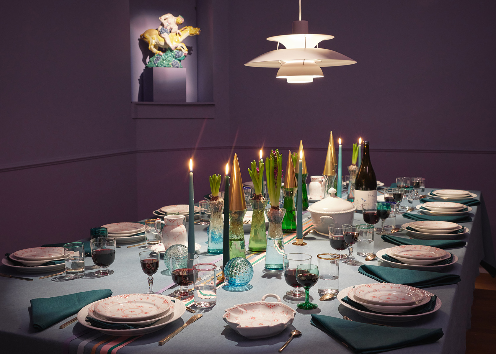 Alberte mixes new, old, and homemade on her Christmas table, which exudes joy and liveliness. Purple, aqua, and coral-coloured tones from her colorful childhood in the 1960’s and 1970’s set the stage and engage in a poetic dialogue with a figure created by her grandfather, the sculptor Jean René Gauguin, for Bing & Grøndahl, as well as a painting depicting Alberte and her mother painted by Alberte's father. On the Christmas table, an aquamarine linen tablecloth forms the crisp background for Royal Copenhagen's Blue Fluted Half Lace and Coral Fluted Lace tableware. Hyacinths in coloured glass vases with homemade gold caps, as well as a row of colourful glasses, give an air of the light nights of spring soon to come.