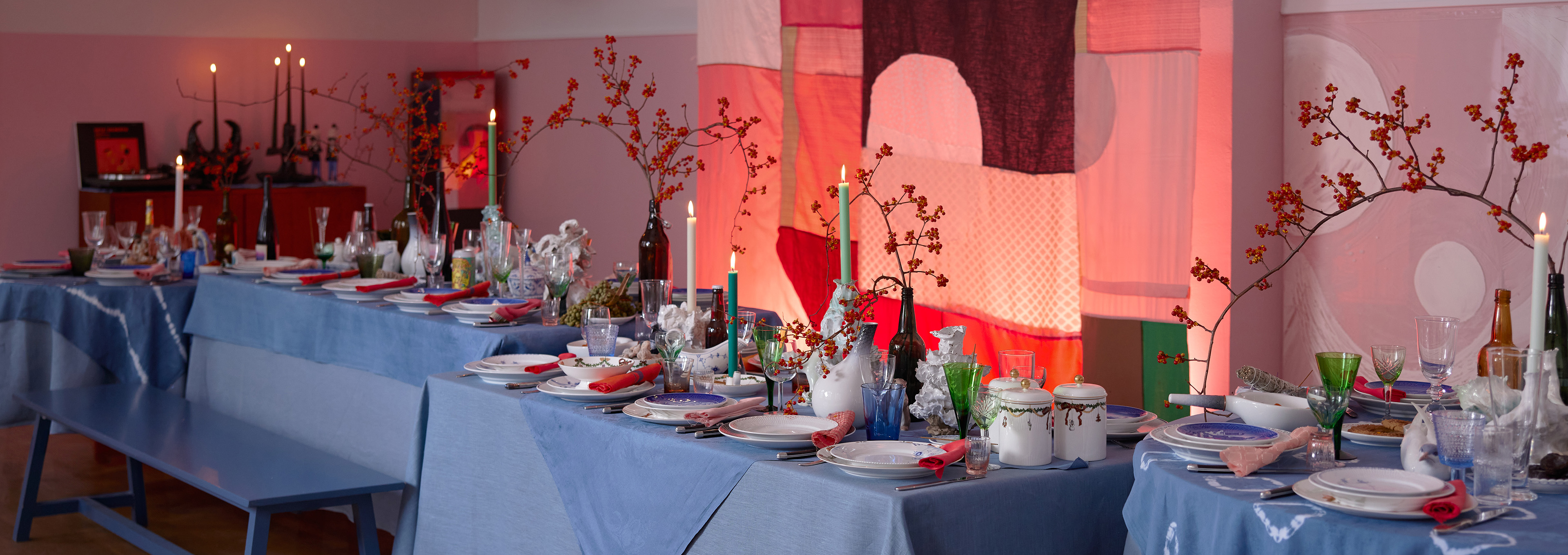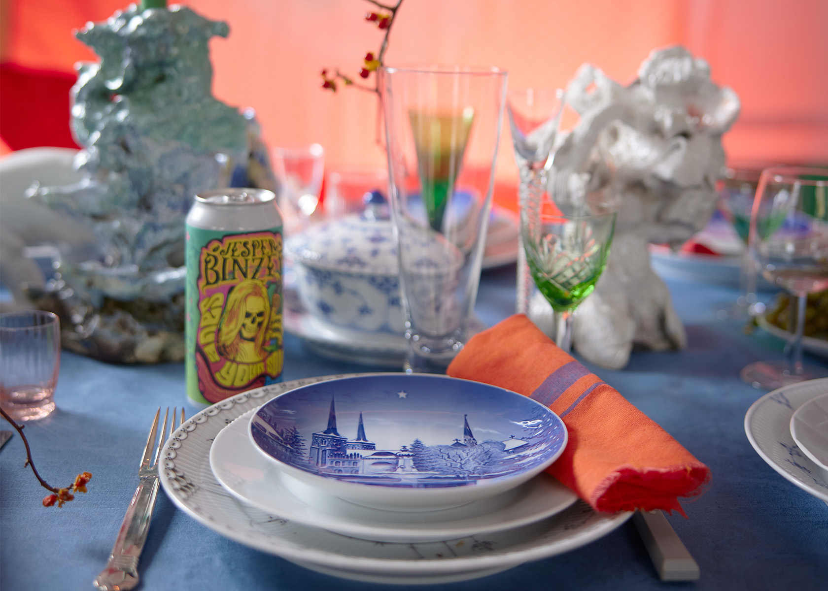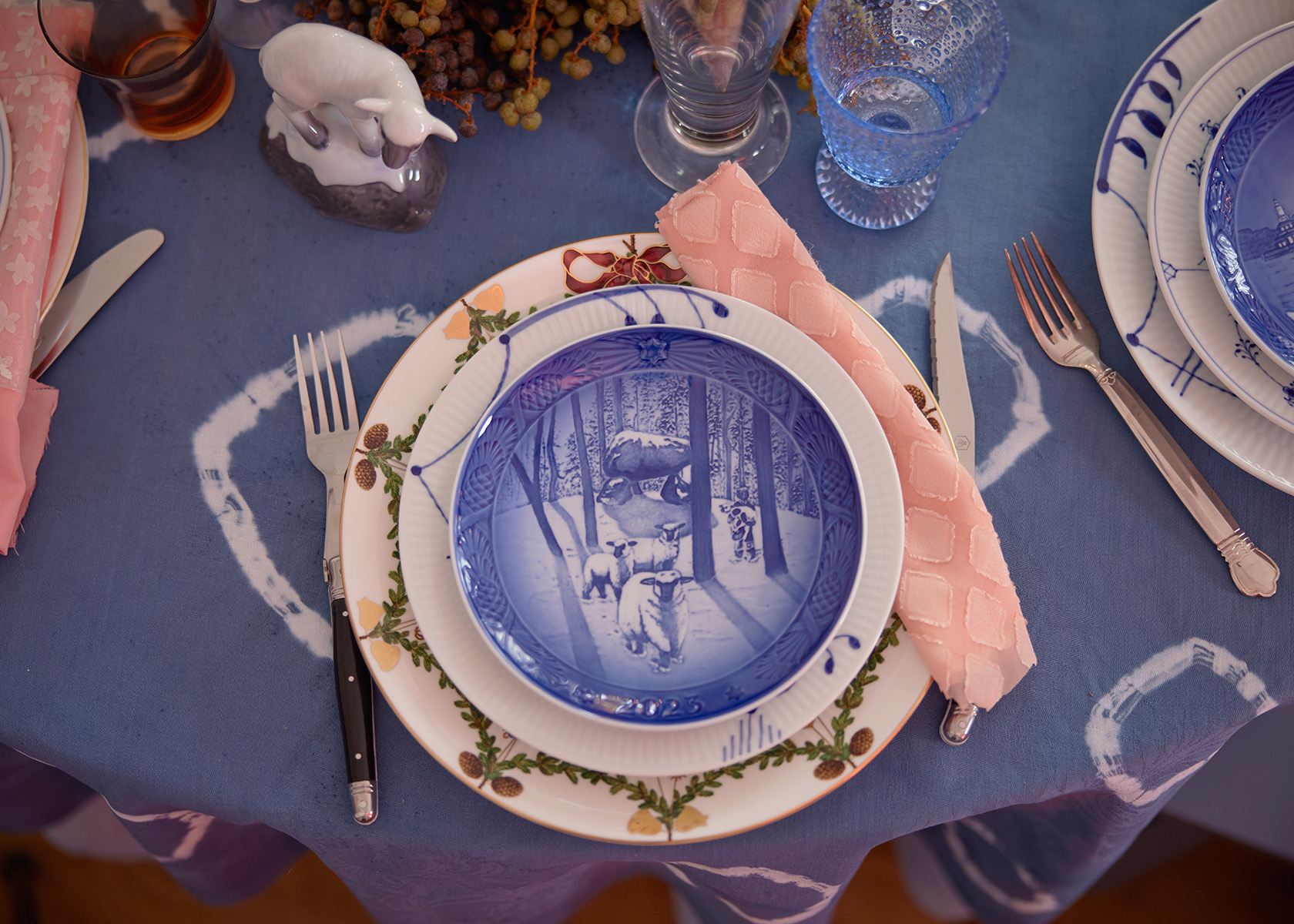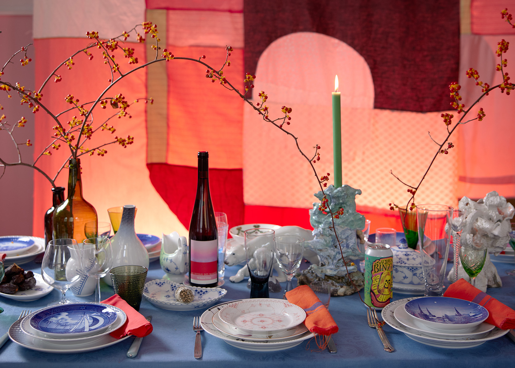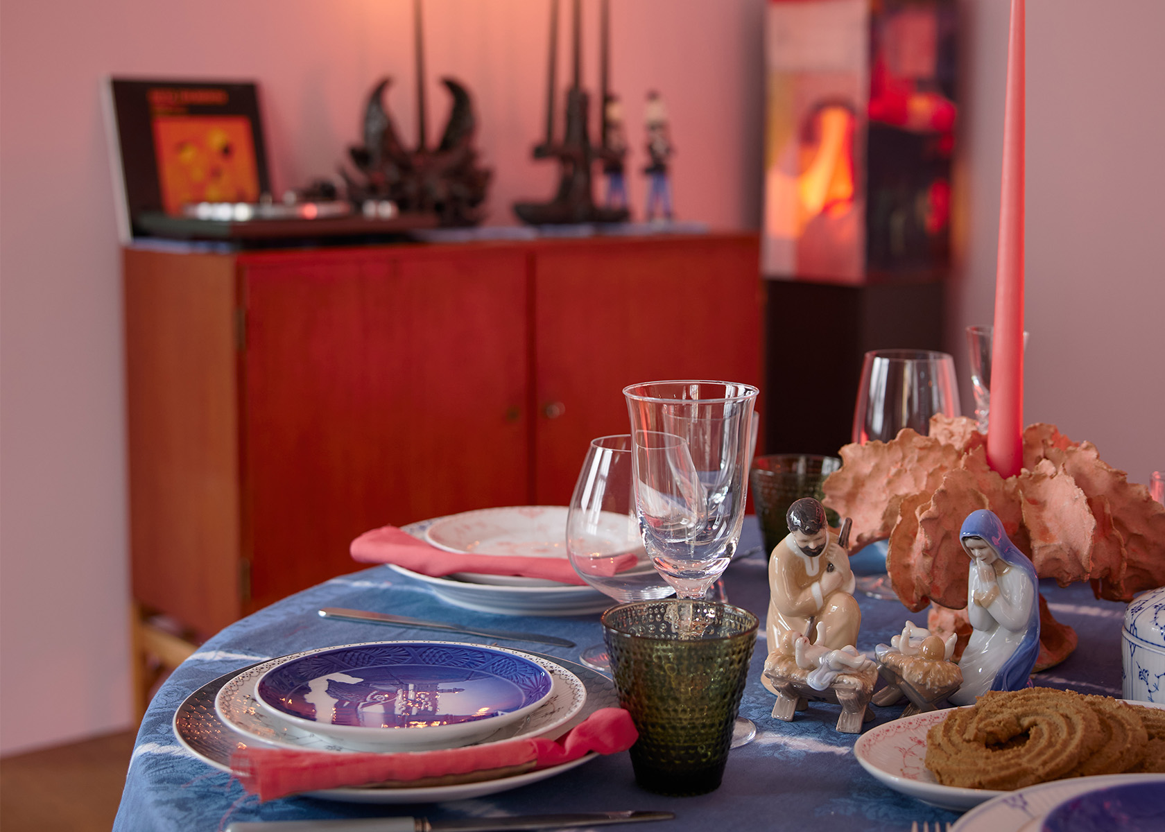 Jesper Binzer’s unpretentious approach to Christmas is expressed in a series of irregular tables of different sizes, covered with blue vintage tablecloths with batik patterns. The table is set with a lovely mix of tableware, old Christmas plates and figurines, and Tibetan prayer flags hang above the table, casting prayers to the skies. Specially crafted unique ceramic pieces, a Pojagi-inspired tapestry and hand-painted wall decoration are created and added by the Danish artist, Anika Lori – and enhance the eclectic vibe. There is not a Christmas present in sight! Instead, an old record player and a stack of records invite guests to find their holiday tune.