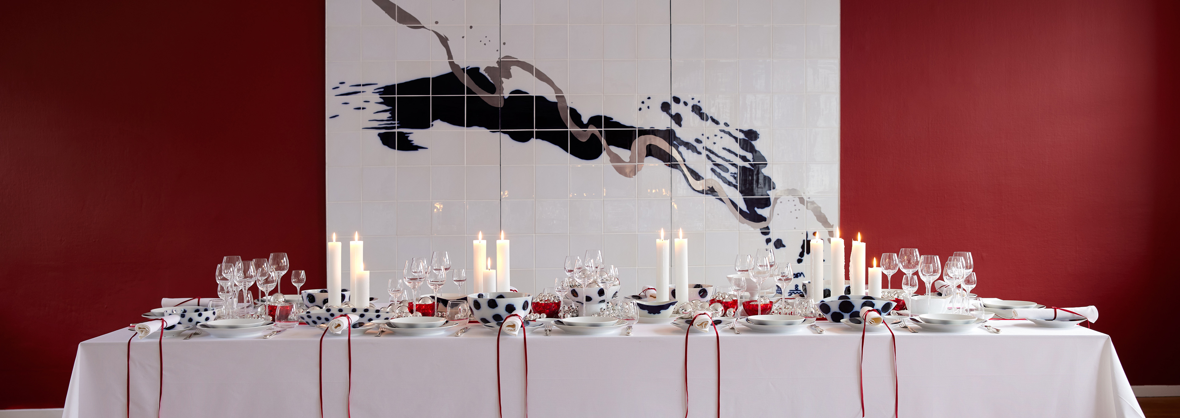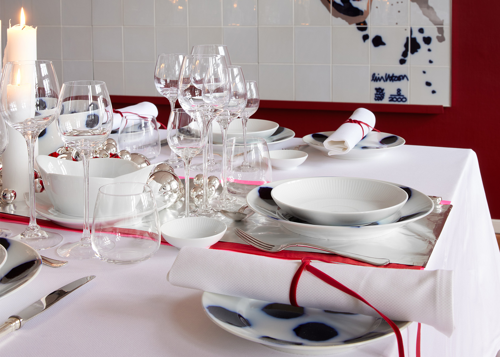 The table is set for twelve people, leaving room for children and grandchildren coming home from all corners of the world – all of whom love Danish Christmas just as much as Lin Utzon herself. The white piqué-woven damask tablecloth forms the serene base, which is counterbalanced expressively by red and pink tissue paper, and a ribbon of silver paper with room for plenty of silver baubles and live candles. Behind this table which is at once sumptuous and simple and a testimony to the artist's sense of colours and materials, hangs one of Lin Utzon's own works: a large three-winged ceramic relief with an imaginative pattern, which poetically represents the different epochs in a life marked by constant change.