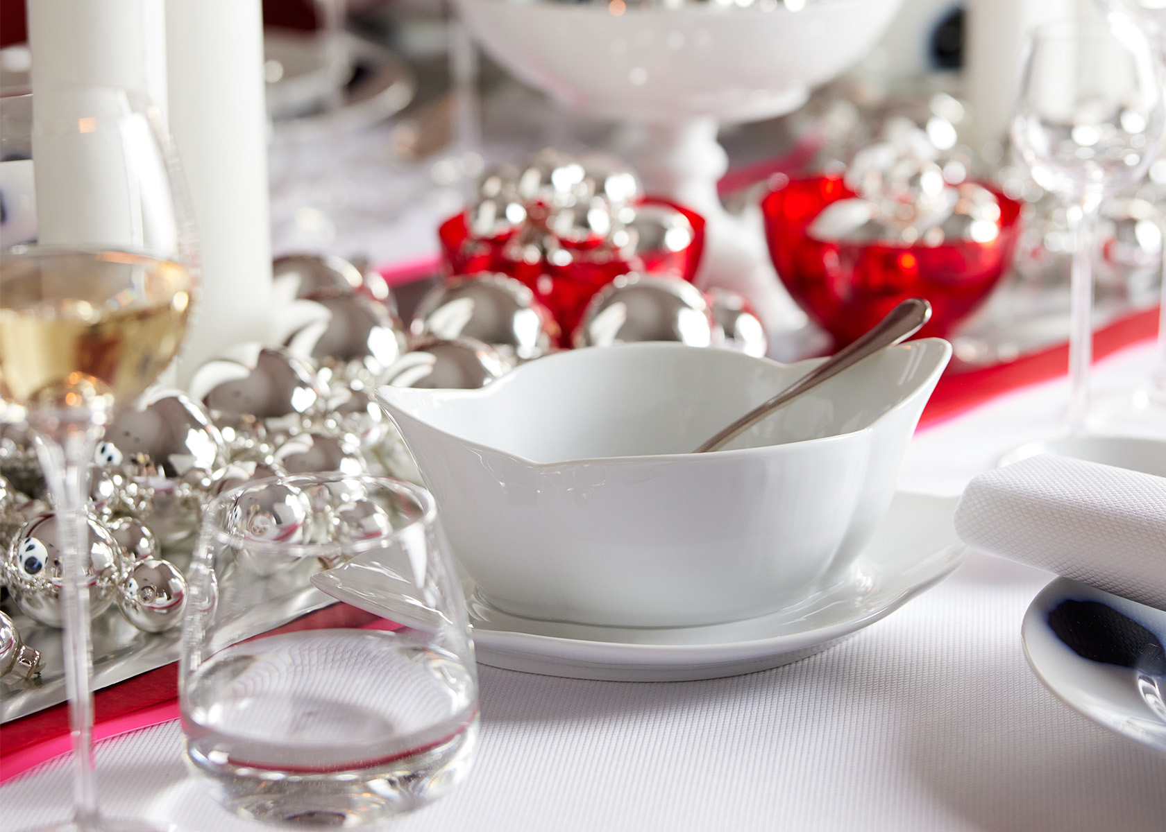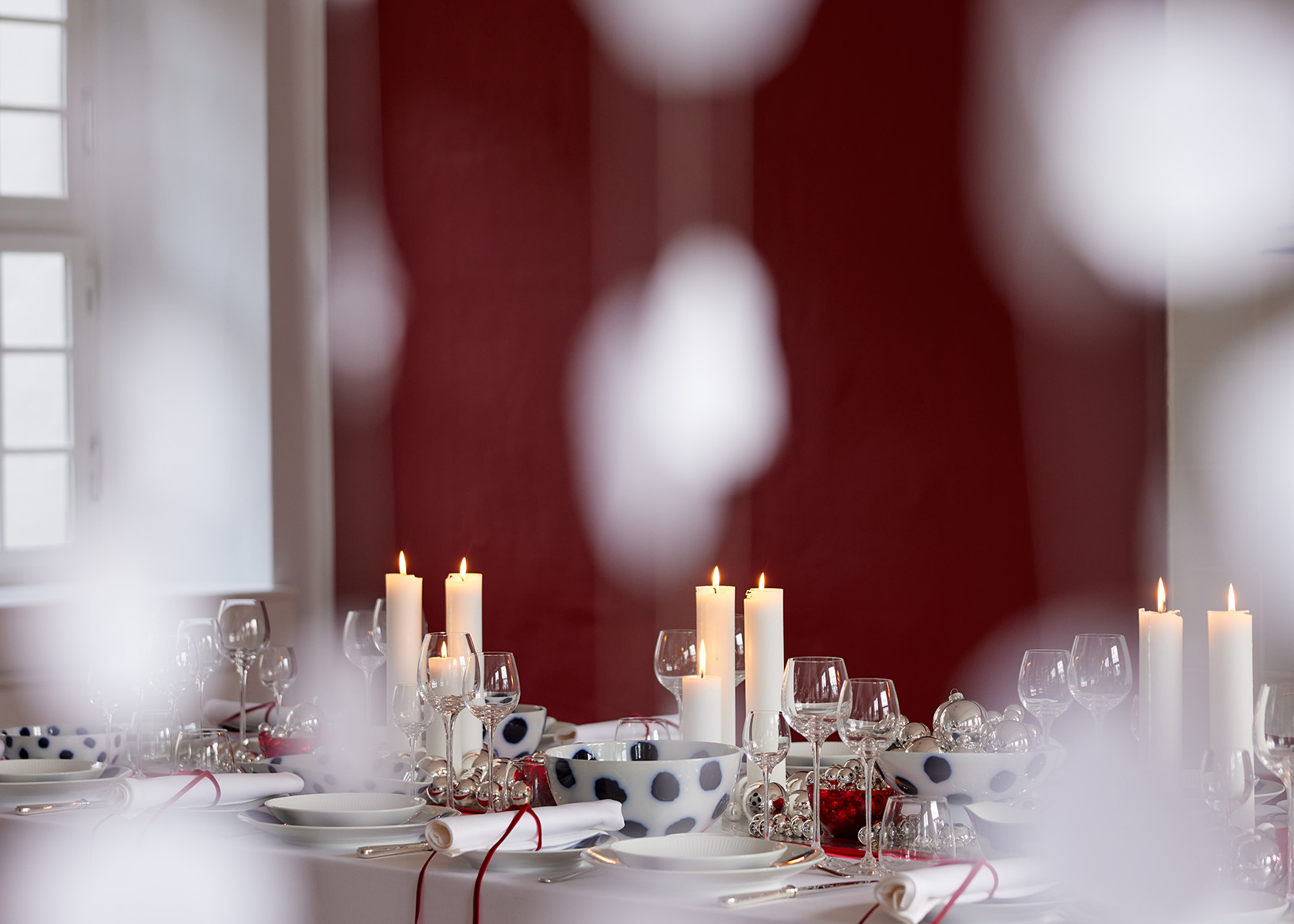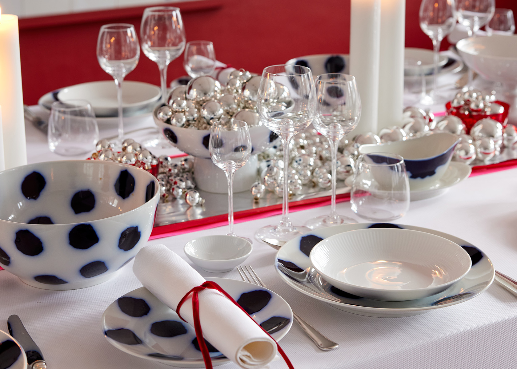 Lin enjoys decorating and setting a festive and lavish Christmas table with simple but effective features. In many ways, the Christmas table is a tribute to Royal Copenhagen, which, according to Lin Utzon, helped establish her as an artist when she was first invited to decorate a Christmas table in 1986. So, she sets the table with her own collection of porcelain – which was never put into production – decorated with azure blue dots. The tableware is accompanied by elements from Royal Copenhagen's White Fluted collection, as well as a series of boat-shaped and dotted bowls designed by Lin Utzon's friend, ceramicist Ivan Weiss.