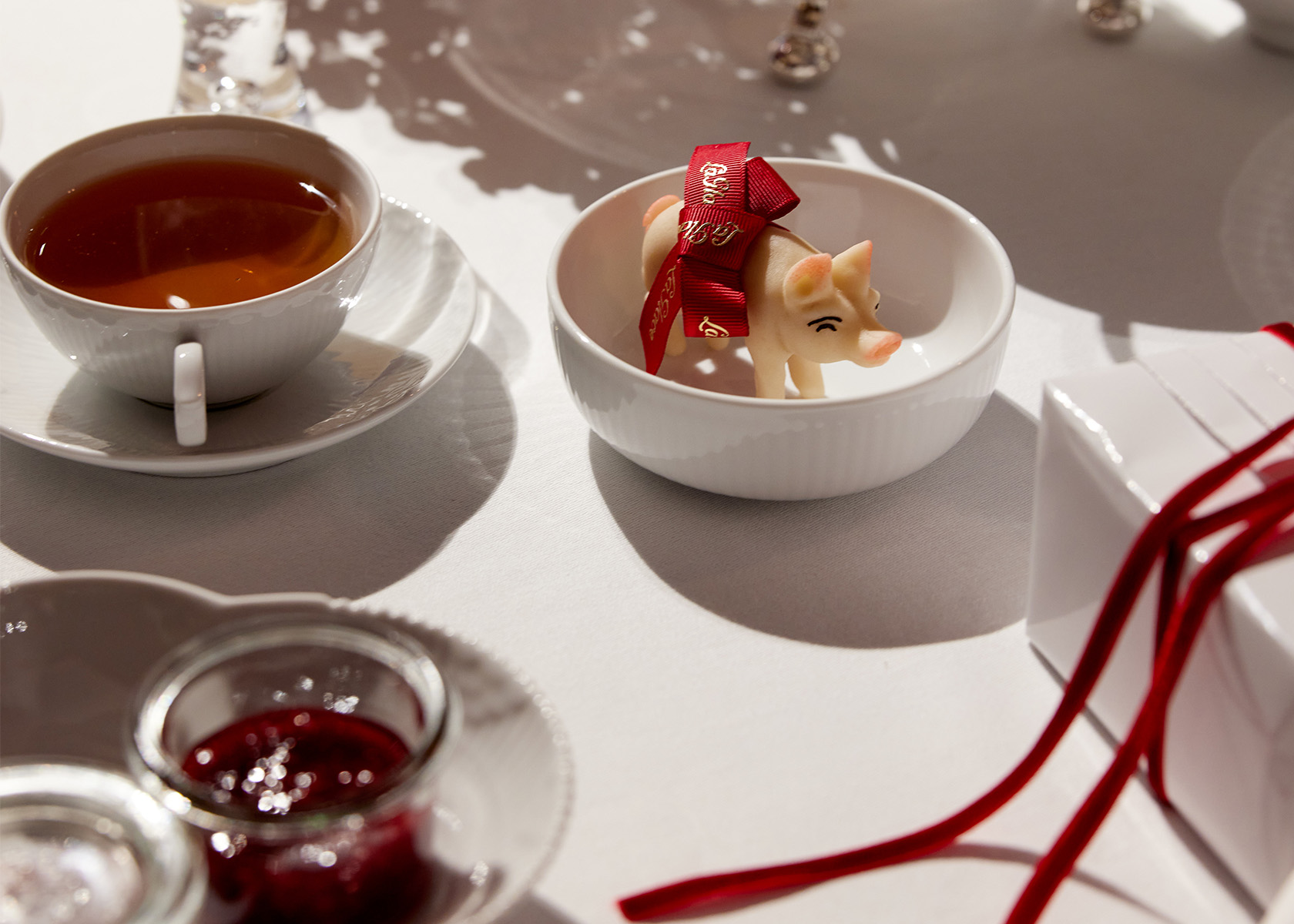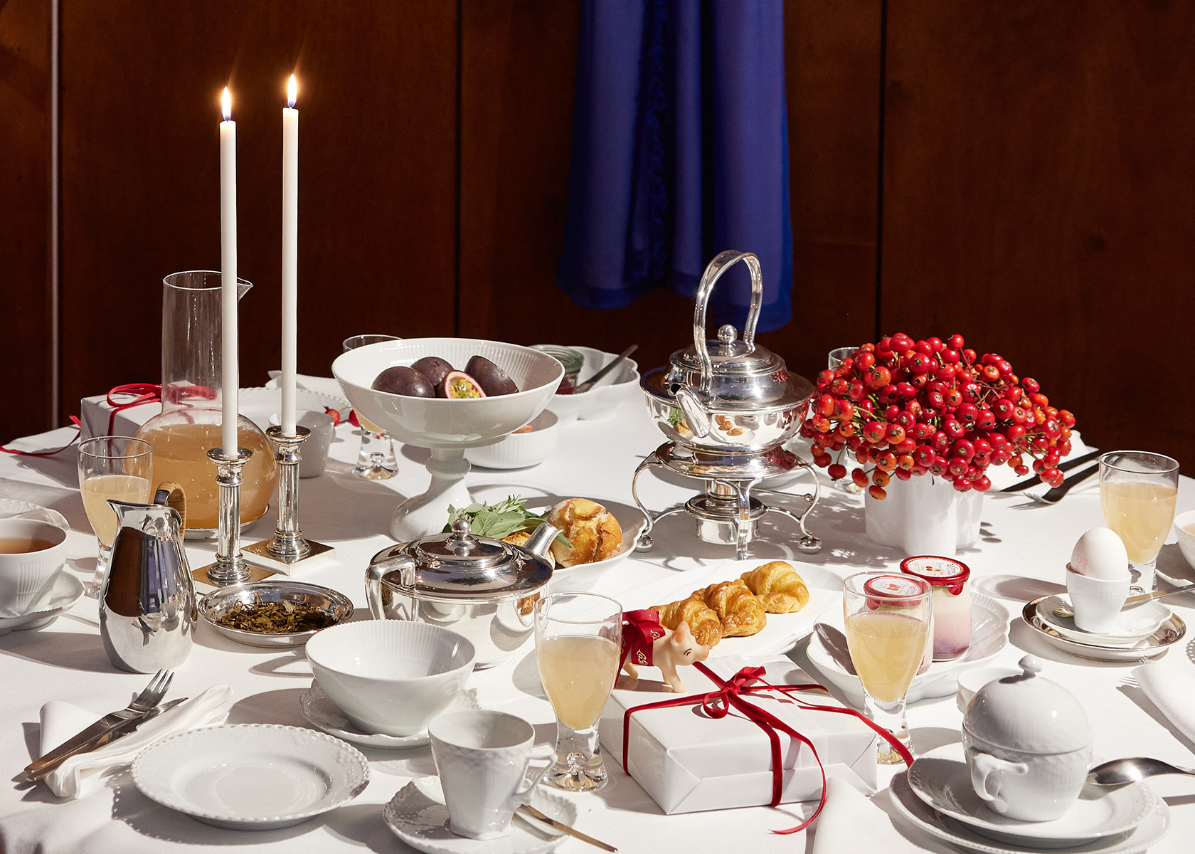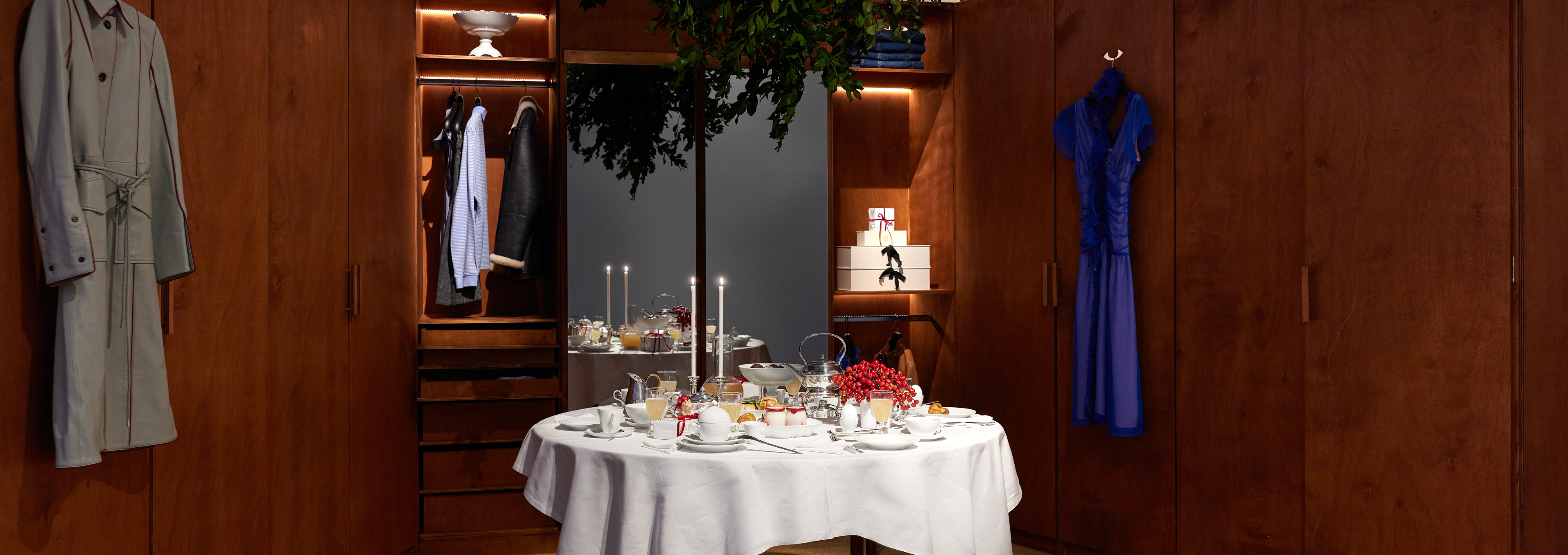 Here, the table is set with a crisp white tablecloth and a mix of Royal Copenhagen's white tableware; White Fluted Full Lace and White Fluted Half Lace, White Elements, as well as pieces of White Fluted - all complemented by Arne Jacobsen's stainless-steel cutlery, Kay Bojesen's ice bucket, lots of candles, mistletoe, and red accents. The table is surrounded by a large open wardrobe with a reference to Saks Potts' beautiful store in Bredgade in Copenhagen, where you are invited into a large walk-in closet filled with clothing for the perfect wardrobe, meaning classic designs twisted with special Saks Potts details.