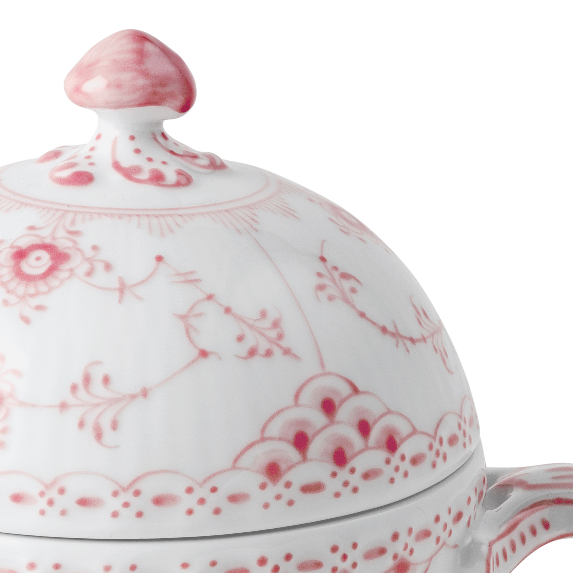 The Coral Fluted Half Lace Sugar Bowl is as charming as it is decorative. The soft coral hue of the floral decorations add a touch of romance to this piece, that is a classic addition to any table. Hand painted in the in-glaze technique and complete with the signature snail shell lid, this is a delightful piece for the modern collector.