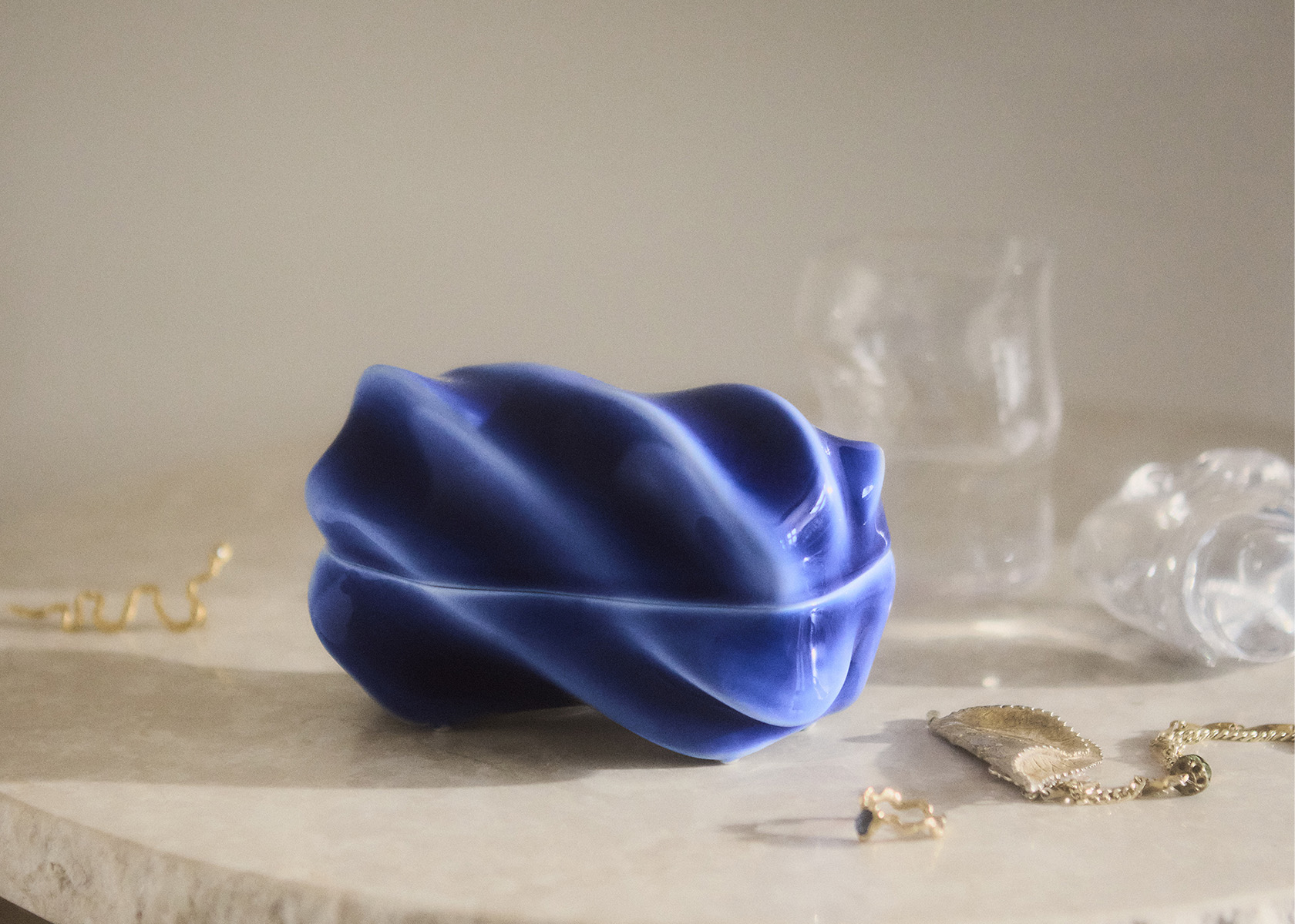 Its opening almost invisible, the Kontur bonbonniere is a small piece of art that will keep little secrets and treasures hidden underneath a meticulously crafted surface of rolling blue waves. The colour is spray-painted by hand, which gives the blue nuances incredible depth and also means no two pieces are identical.