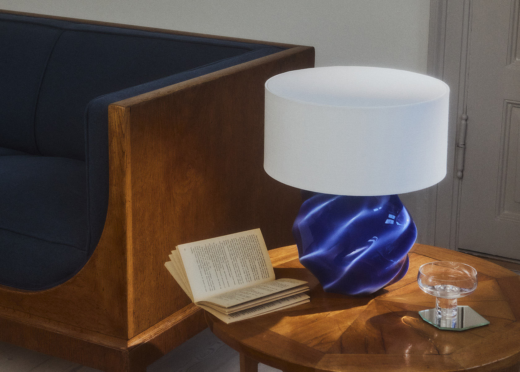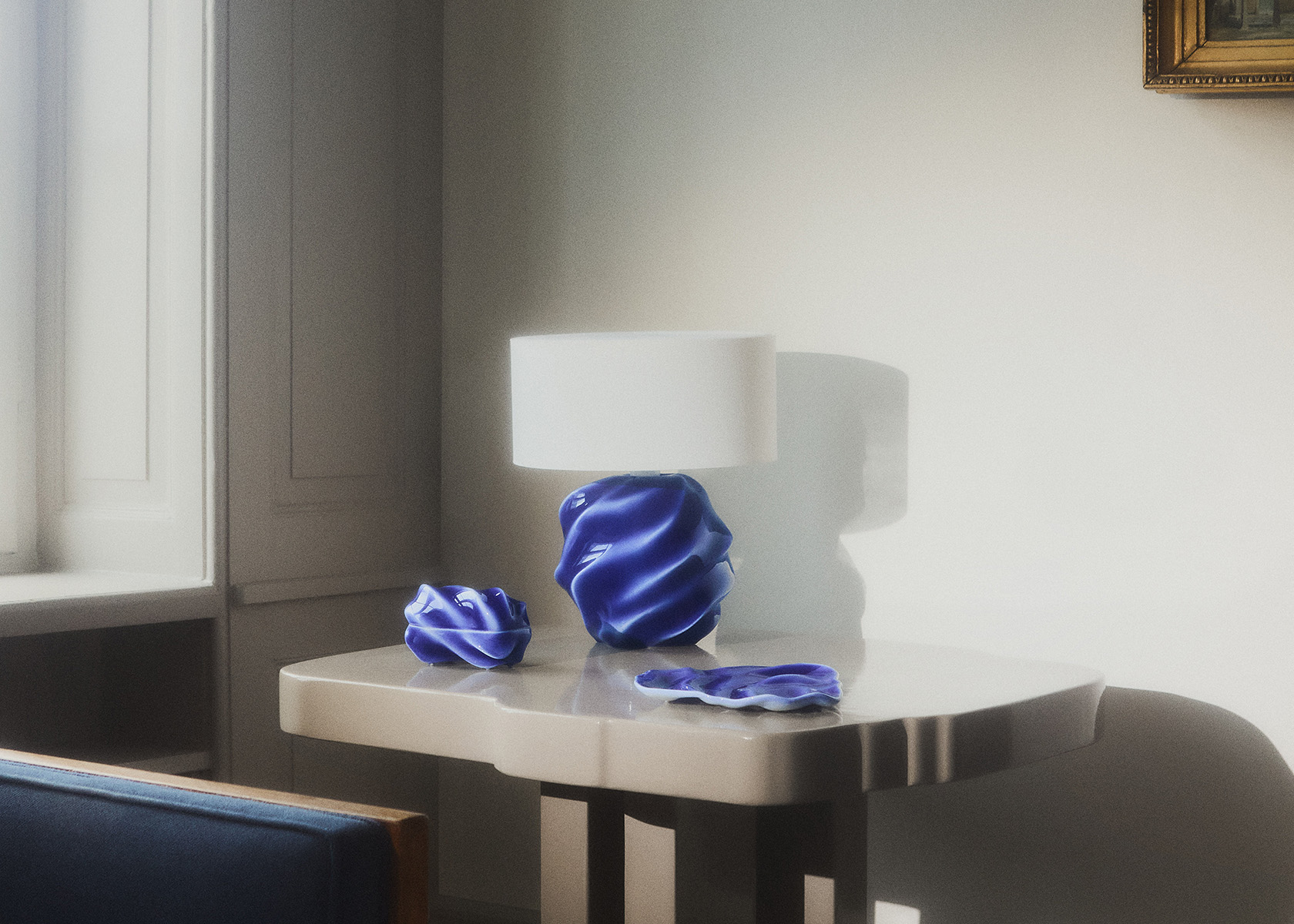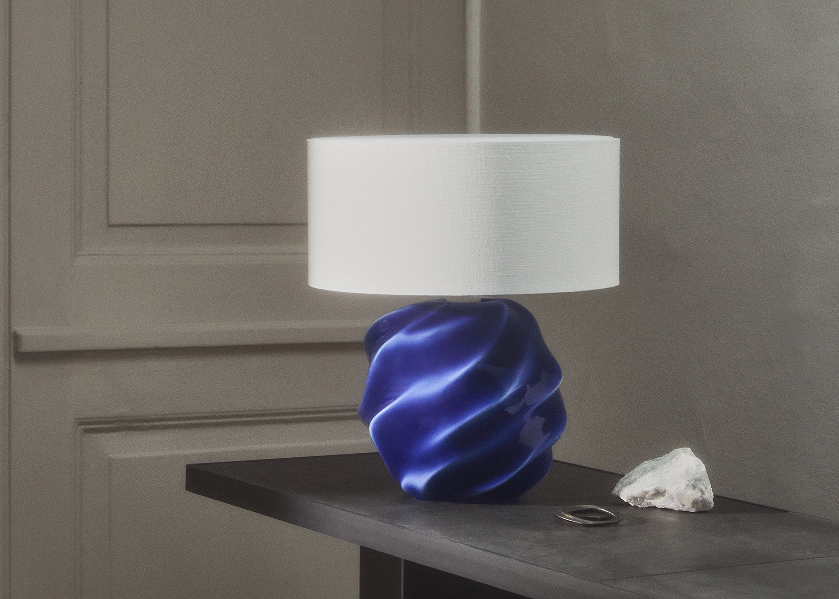 The soft, fluid structure of the striking base contrasts beautifully with the gracefully simple shade, whose downward-facing opening creates an eye-catching play with light and shadow in the blue waves. Spray-painted by hand, this Limited Edition lamp is a bold statement piece of the highest quality.​