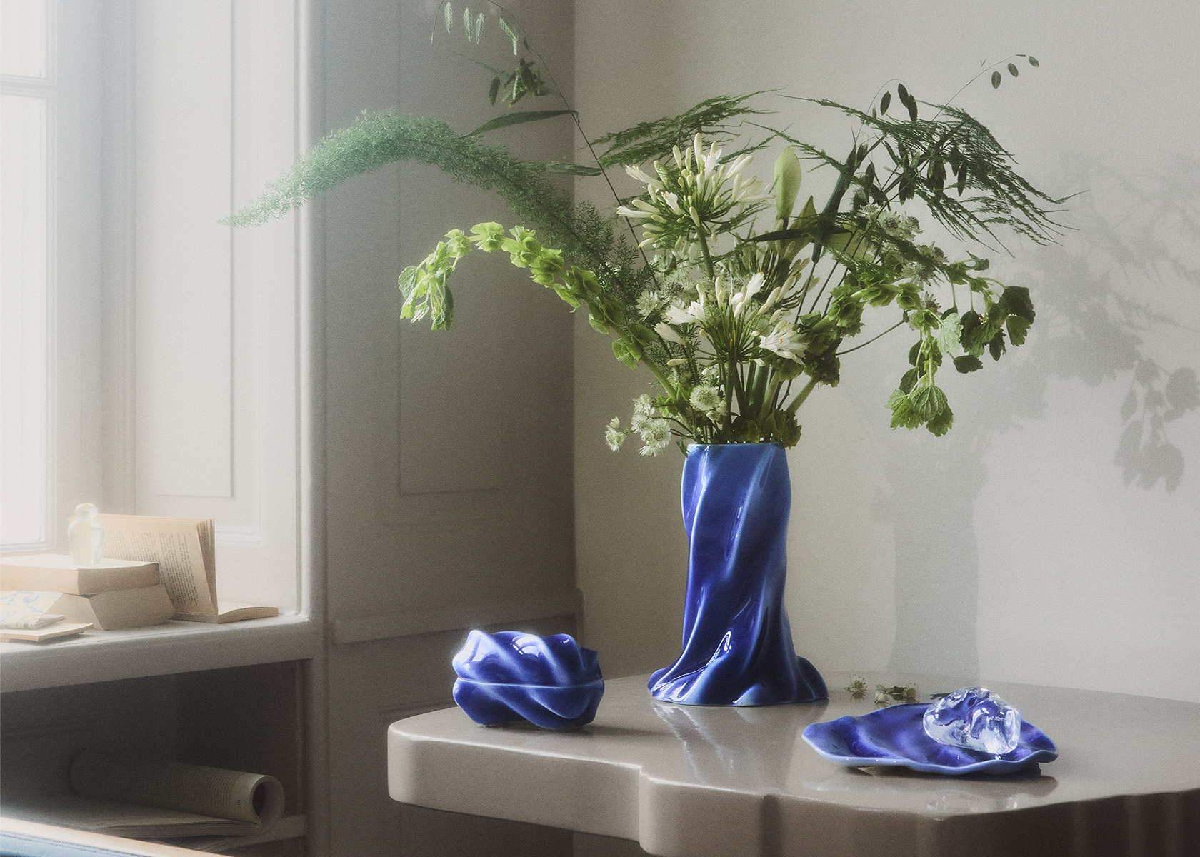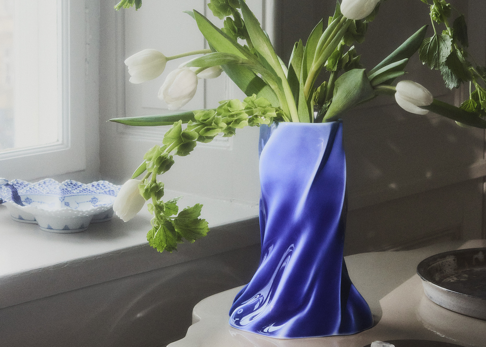 The unique shape of the Kontur vase gives it the appearance of a tree growing from the surface it sits on, or a whirlwind in constant motion. With its broad base and slightly narrower top, the vase is suitable for larger bouquets, the nuanced blue colour matching any flower combination.