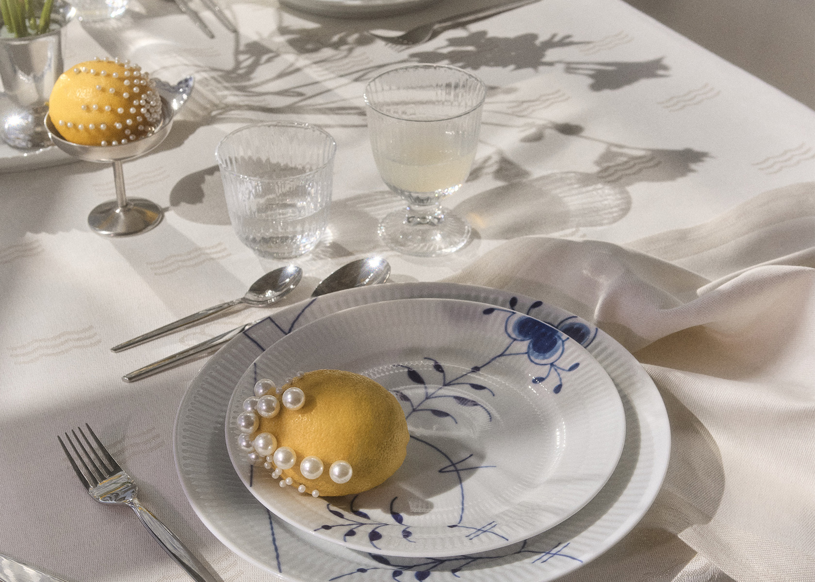 Waves bring a contemporary expression to the table, with a subtle jacquard weave that incorporates Royal Copenhagen’s iconic crown and three waves — symbols that have adorned every piece of Royal Copenhagen porcelain since 1775. Available in both deep blue and soft white, Waves offers tablecloths, placemats, and napkins.
