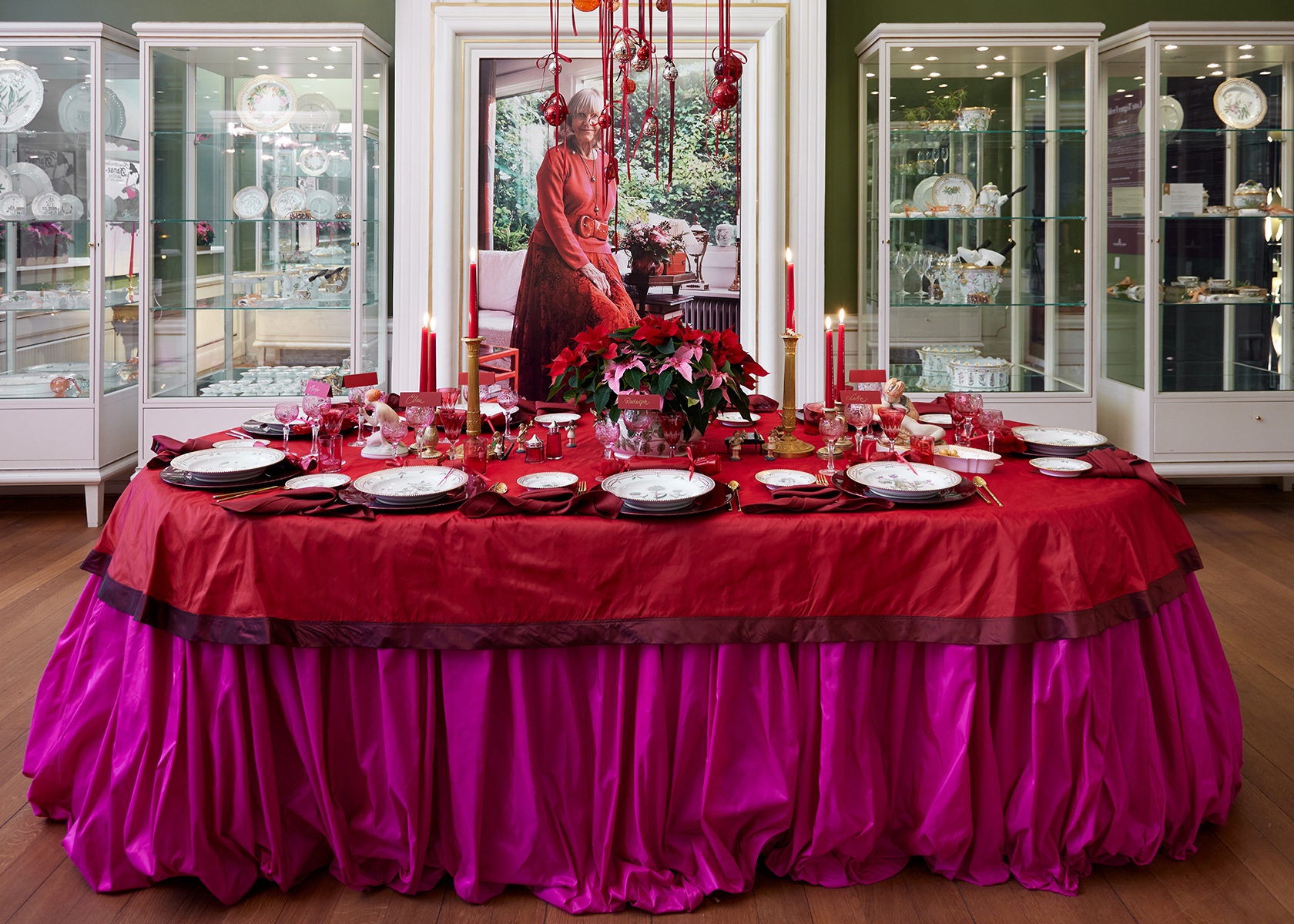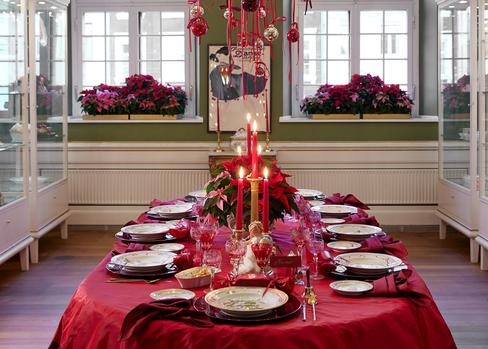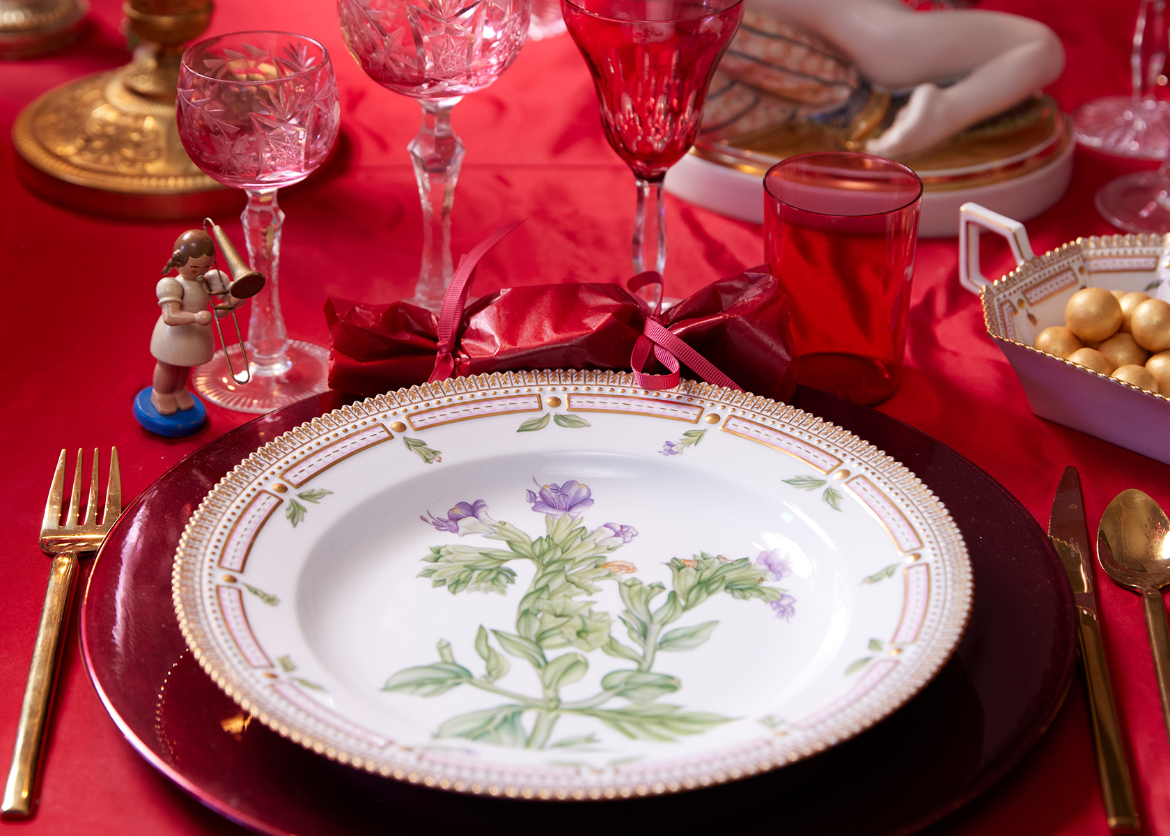 As a tribute to her grandmother and an expression of her own joy of hosting and of setting a festive table, Lotte Tegner Freddie recreates the holiday universe of her childhood in her Christmas Table. The table is set with Flora Danica, including a bowl for the classic Danish rice pudding. Golden cutlery, crystal glasses, burgundy port glasses, and a symphony of red and pink flowers complete the grand setting.