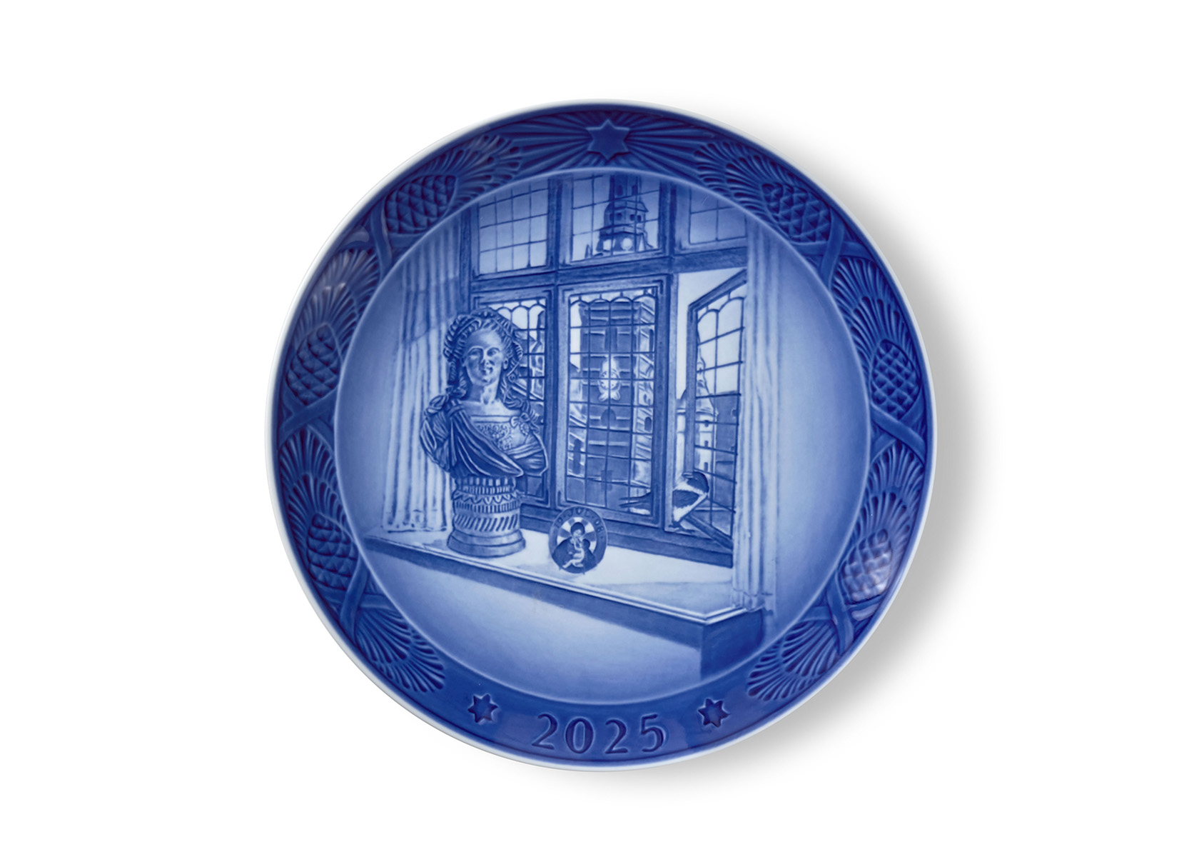 Designed for Royal Copenhagen's 250th anniversary, the 2025 Royal Copenhagen Annual Plate depicts a bust of Queen Juliane Marie, who was one of the founders of the porcelain factory in 1775. Next to her on the windowsill is the first-ever Royal Copenhagen Annual Plate from 1908, and through the window you can see Frederiksborg Castle.