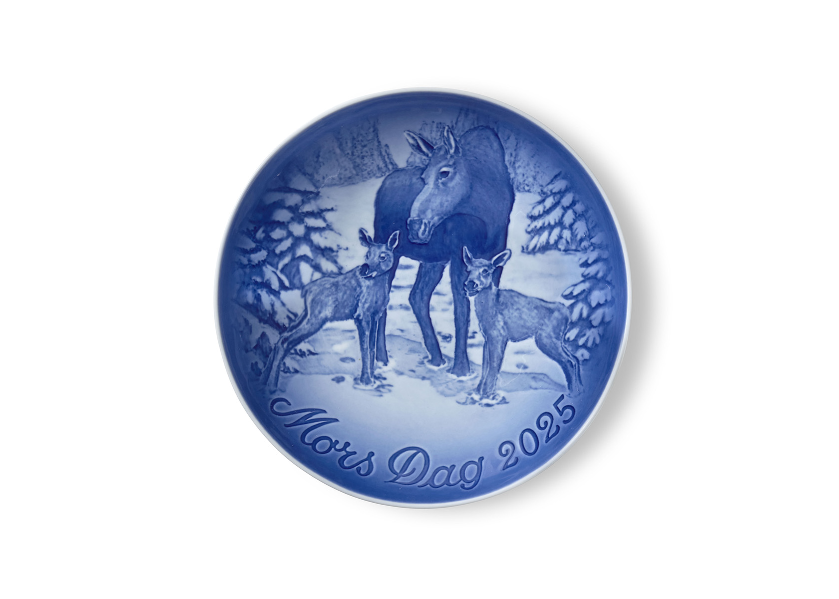The motif of the 2025 Bing & Grøndahl Mother's Day Plate features a cow moose and her two calves in a clearing. A gentle giant from the north never before featured on an Annual Plate, the moose is a majestic creature with the mild disposition. Like every year, the motif is designed by Dag Samsund.