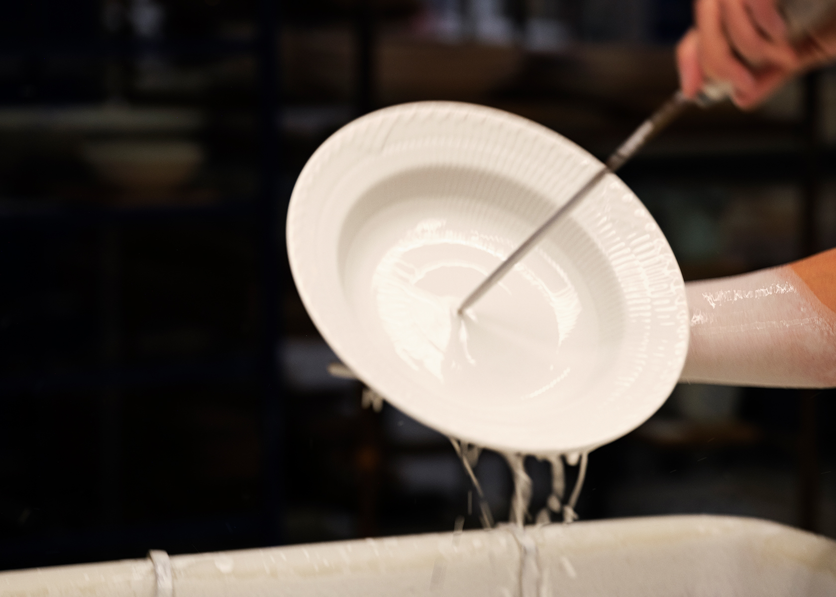 The porcelain is given shape and fired for the first time leaving it as “biscuit” porcelain. The porcelain is then glazed as you can see in the image and fired for the second time at 1375°C which causes the porcelain to shrink up to 14%. The porcelain is now technically a finished undecorated product, and it is time to apply the decorations.
